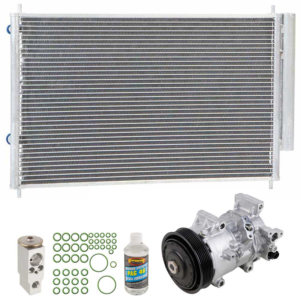 This 5 piece Premium Installers AC Kit includes an OEM new AC compressor, condenser with built in accumulator/drier, expansion device, a bottle of AC compressor oil and a pack of the correct o-rings for your system to prevent leaks. This kit is designed to include all of the right parts to make the repair process easier and save you money. The accumulator/drier used in your AC system is built into the condenser, so to make things easier this kit includes a new condenser with built in accumulator/drier.