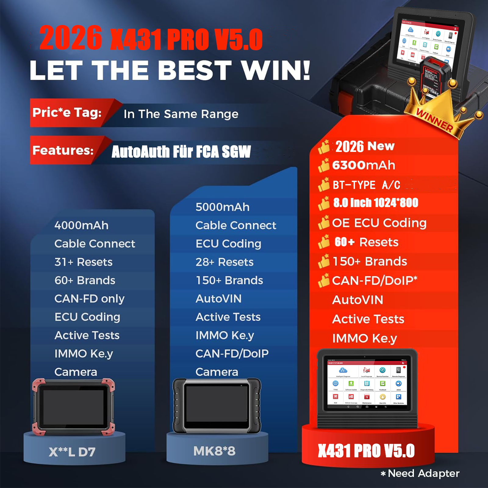 Das LAUNCH X431 PRO V5.0-Diagnose-Scan-Tool ist auf umfassende Diagnosen und mehrdimensionale Tiefeninspektionen ausgerichtet und bietet nicht NUR bessere Ergebnisse bei den Wartungsfunktionen und der ECU-Codierung, sondern erzielt auch große Erfolge bei den Zusatzfunktionen: Batterietester (BST360), Videoskop (VSP600), IMMO-Programmierer (X-PROG3), Scopebox, Sensorbox, Multimeter, ADAS, WiFi-Drucker usw.