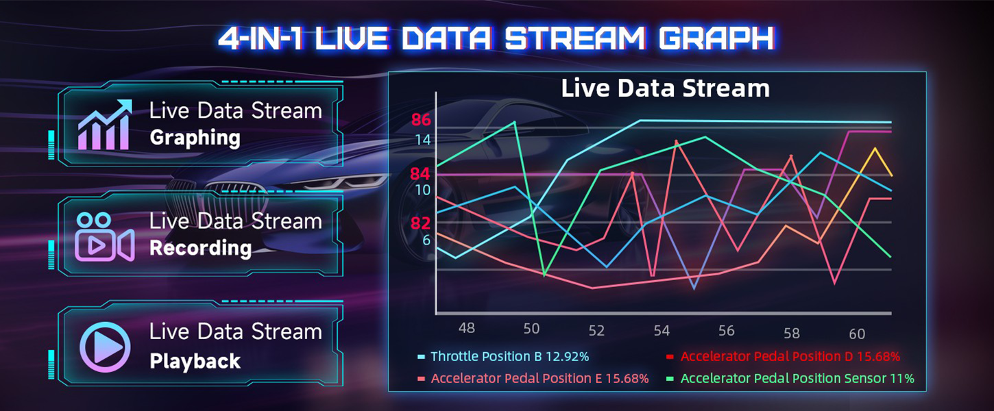 LAUNCH CRP123i V3.0 Scan-Tool 4-IN-1 Echtzeit-Grafikdatenströme, die Ihnen helfen, die momentanen Änderungen des ENG/AT/ABS/SRS-Systems des Fahrzeugs anzuzeigen. Die Detailanalyse kann vergrößert werden. Die Live-Daten können außerdem aufgezeichnet, wiedergegeben und geteilt werden. Es kann Einblick in die Gesamtleistung des Fahrzeugs geben und kann auch als Leitfaden für die Fahrzeugreparatur verwendet werden.