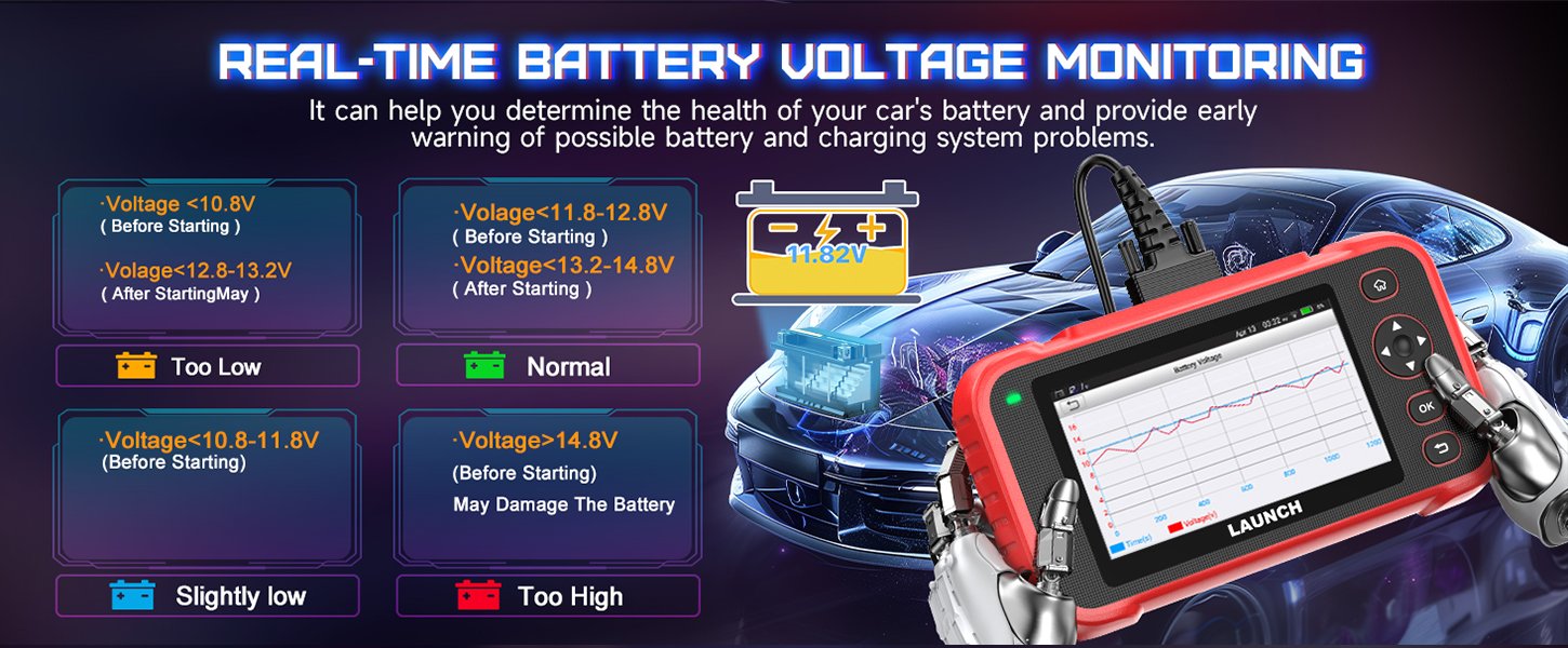>>>Echtzeit-Batteriespannungstest: CRP123i V3.0 verfügt über eine zusätzliche Echtzeit-Batterieüberwachungsfunktion, mit der Sie die Batteriespannung des Fahrzeugs automatisch überwachen und zuverlässige grafische Echtzeitdaten erhalten können. Es kann Ihnen dabei helfen, den Gesundheitszustand der Batterie zu ermitteln und frühzeitig Warnungen vor möglichen Problemen mit der Batterie und dem Ladesystem zu erhalten.