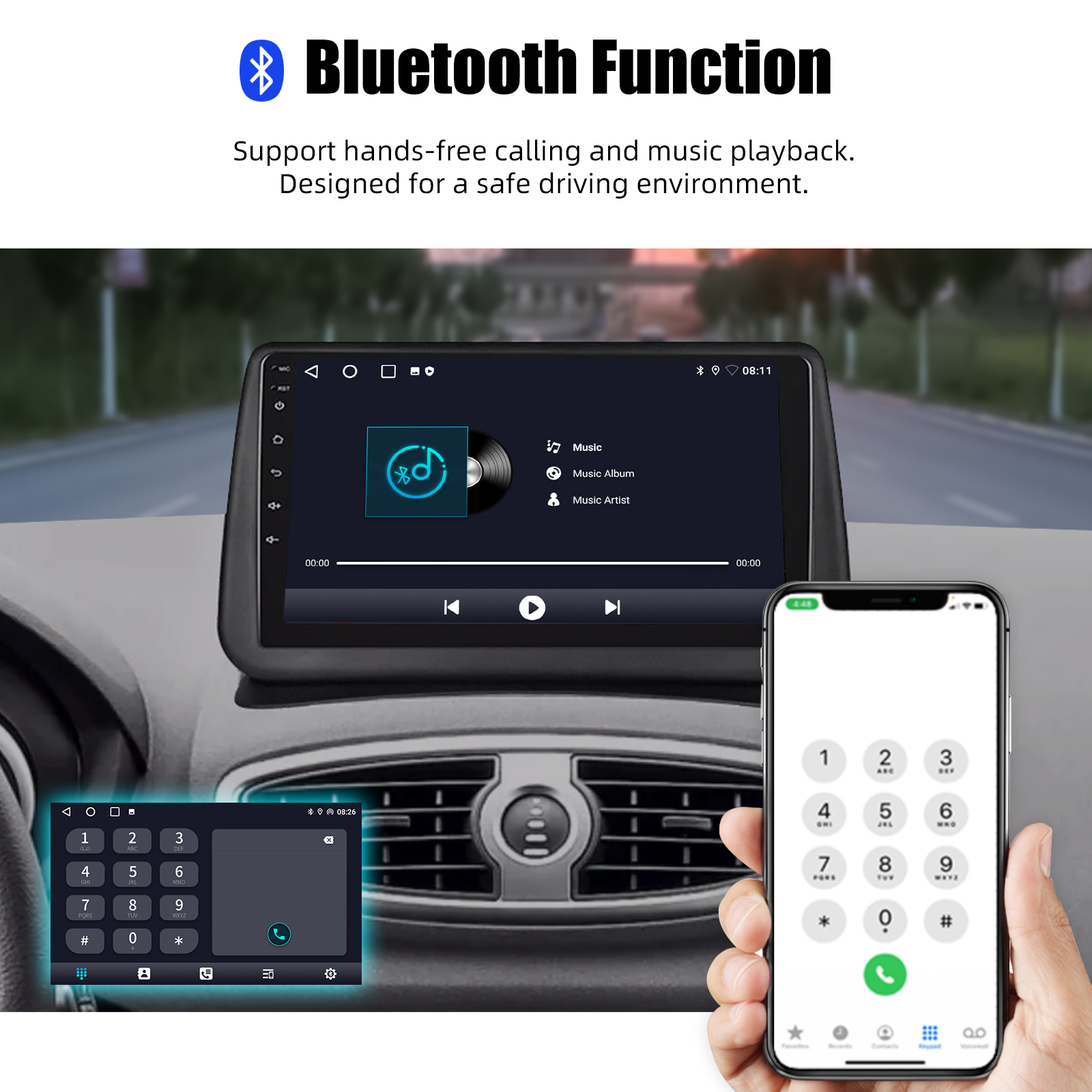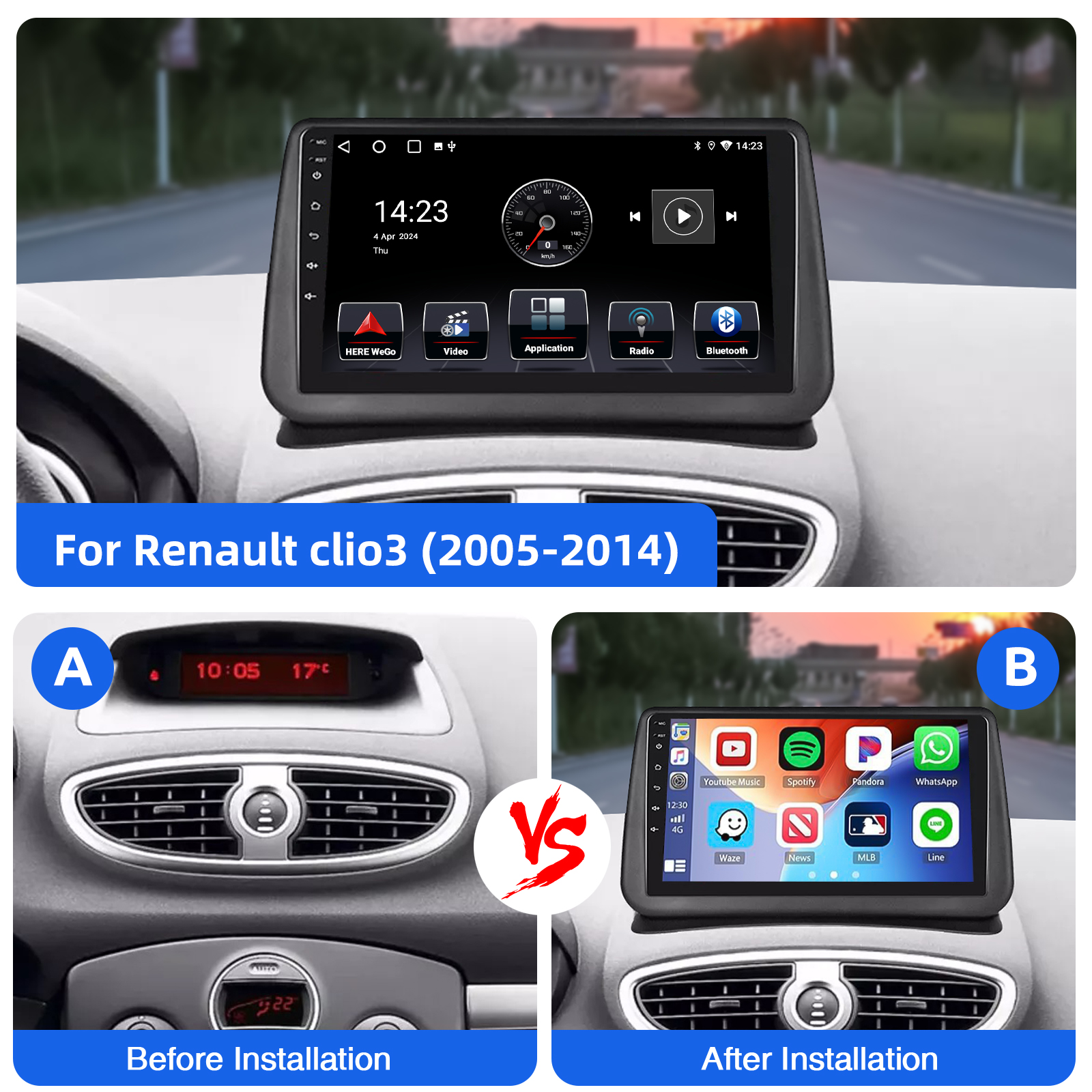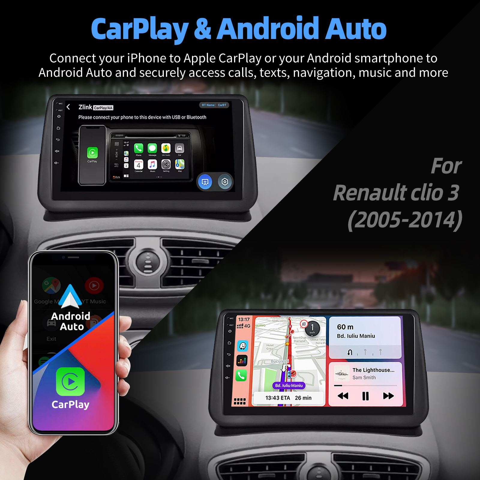 9 inch Android 15 Car Radio for Renault Clio 3 2005-2014:The Android car radio with 9" 1280*720 HD touch screen, 4GB RAM and 64GB ROM allows you to download your favorite apps and videos, so that driving is no longer boring. No additional frame, no cable change, plug and play. It comes with Canbus and supports most of the original functions: steering wheel control, reverse signals and reading original computer data, etc.Wireless Carplay & Android Auto:Immerse yourself in a seamless and user-friendly infotainment experience with Apple CarPlay & Android Auto. Connect your iPhone to Apple CarPlay or your Android smartphone to Android Auto and securely access calls, texts, navigation, music and more. With intuitive operation via the touchscreen or voice control, you have all functions at your fingertips while you remain safely at the wheel. Use your favorite apps and stay connected at all times while keeping your eyes on the road. Turn your vehicle into an extended hub for your mobile devices and experience a new dimension in infotainment.