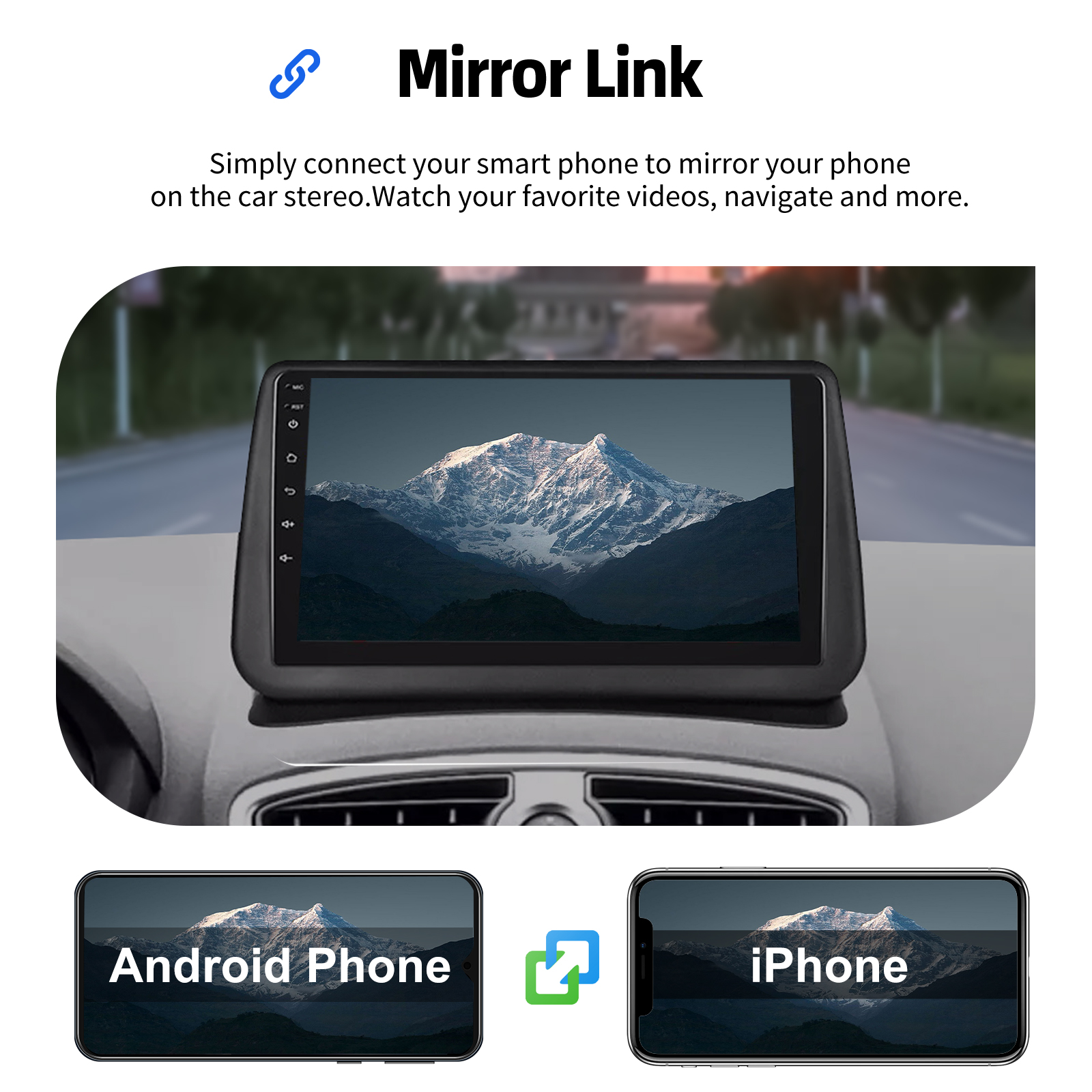 Mirror Link: With this car radio, you will experience the impressive Mirror Link function, compatible with iOS and Android phones. You can mirror your smartphone screen to the car radio using apps like Google Maps, Spotify, Youtube, etc. Replace your mobile phone with the car screen and turn your vehicle into a smart platform.
