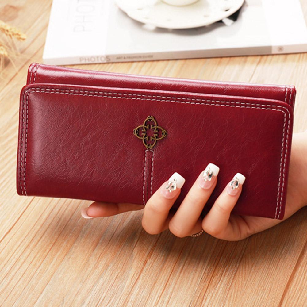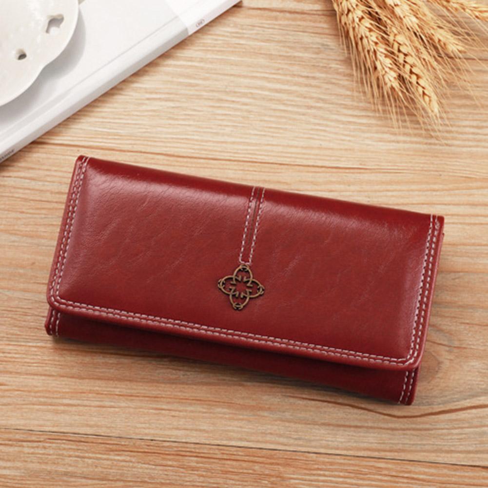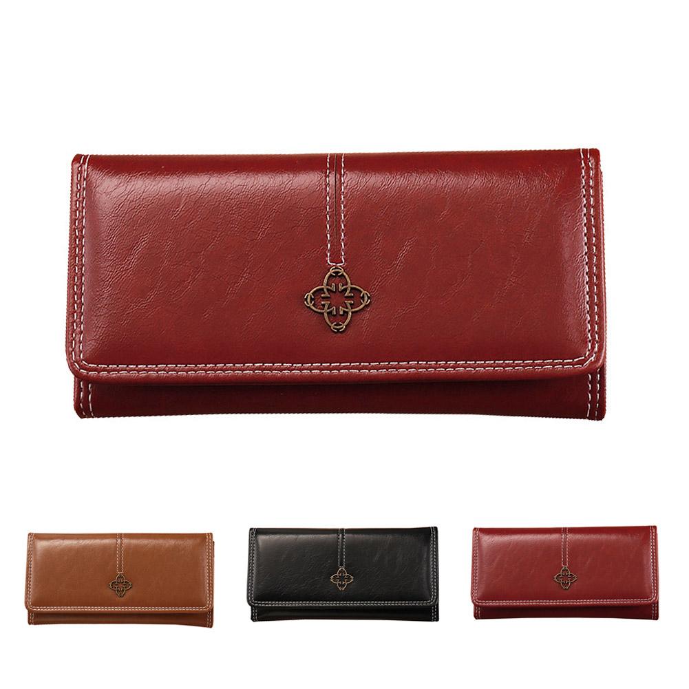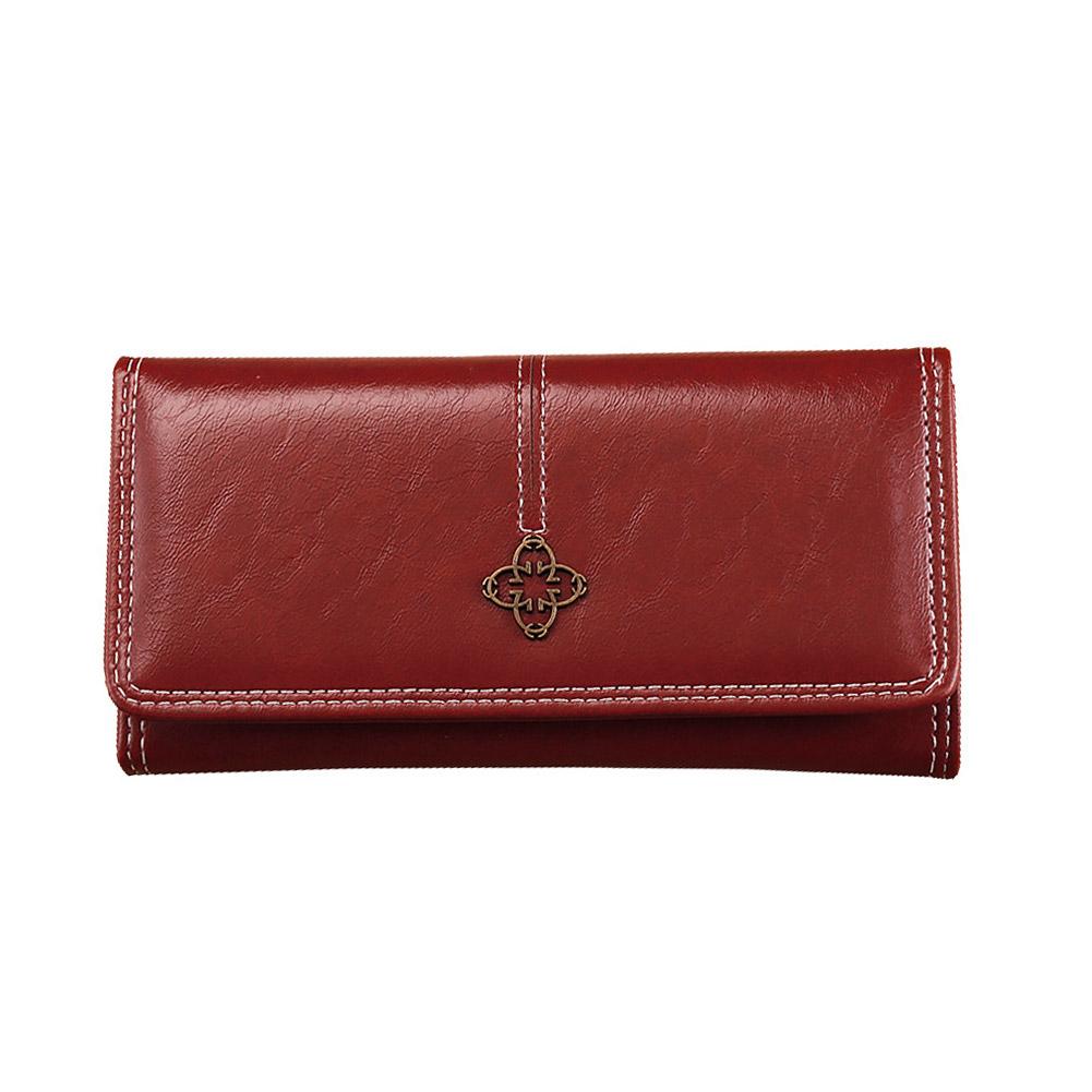 3. Stylish Visual Appeal: This wallet, presented in a rich, captivating red hue as depicted, boasts a timeless design enhanced by elegant white contrast stitching. The front flap is adorned with a charming, antique-style metal emblem, adding a touch of classic sophistication to its overall aesthetic.