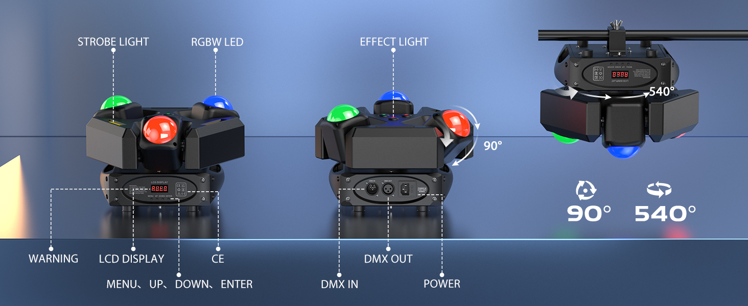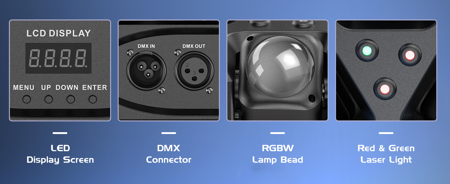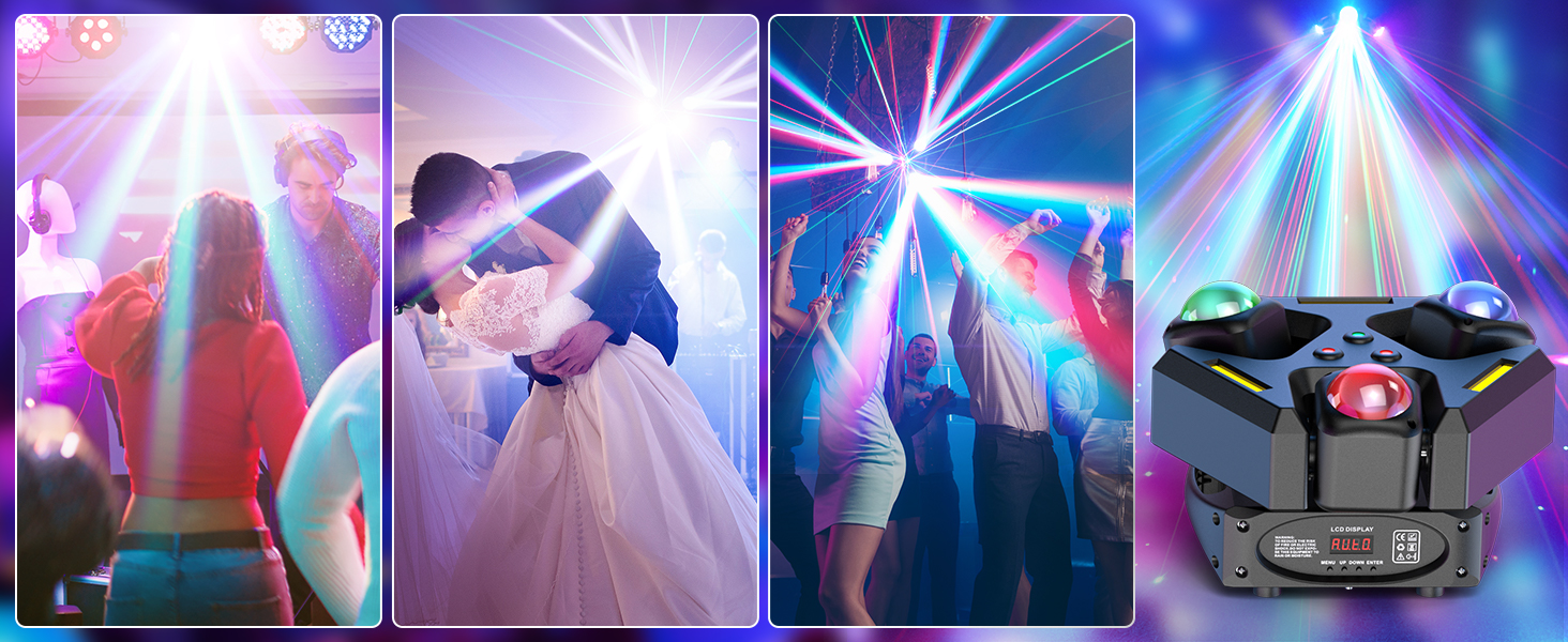 Product Description: This lighting equipment has a simple design, is easy to use, and is ready to go. It has three heads that can produce nine beams. It can also create different effects through the XY axis. It also supports three different effects: red, green, and amber yellow. The product supports self-propelled, voice-controlled, master-slave, DMX, and other modes. It is suitable for DJs, parties, families, audio-visual studios, and other small places.
