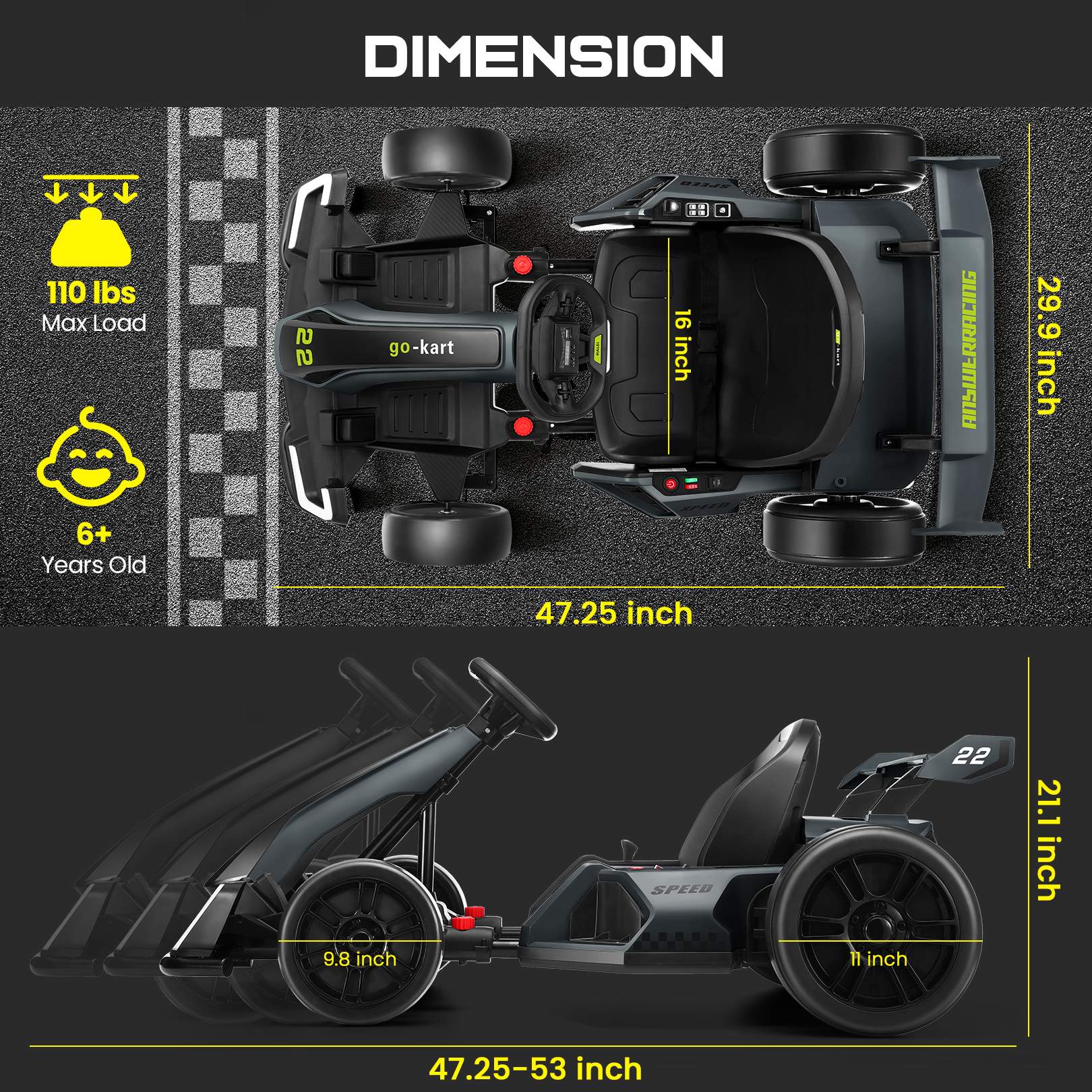 Customizable Seat for Growing Children: This electric go-kart comes with an adjustable seat that offers three different settings, ranging from 47.25 inches to 53 inches. Ideal for kids aged 6 to 12.