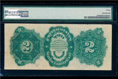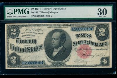Here is a certified 1891 $2 Silver Certificate. Perfect for a type set of clean circulated notes. It has the portrait of William Windom and a tougher type of $2 silver certificate. This is a Fr 246 with signatures by Tillman and Morgan. This note have been graded as a Very Fine 30 note from PMG. You don't have to trust my grading, trust PMG!
