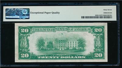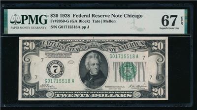 Numerical notes are cool! The first few Federal Reserve Notes had the number instead of the letter of the federal reserve district in the seal to the left of the portrait. Here is a $20 bill from the 1928 series with the large numerical "7" instead of "G" for Chicago in the seal. It is a solid note and has been graded by PMG as a Gem Uncirculated 67EPQ. It doesn't get any better than this as PMG has graded eleven 67's and just one better! You don't have to trust me concerning the grade of the note, you just have to trust PMG!
