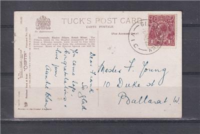 VICTORIA, GLENTHOMPSON cds., 1922 Tuck's India, Hindu Pillars, KGV 1 1/2d. Brown to Ballarat..
