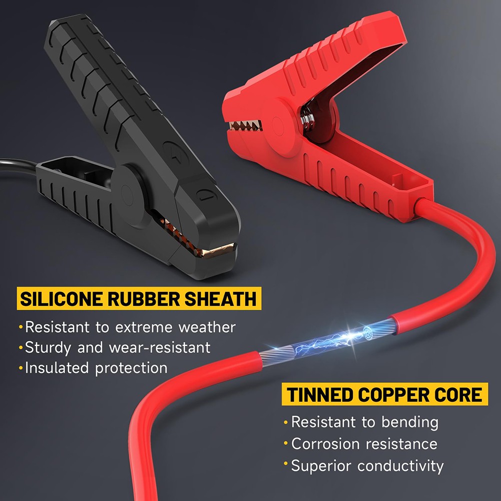 *Safety Features: Engineered with flame-resistant silicone rubber insulation, these cables help prevent sparks during operation. Users are advised to follow safety guidelines to avoid potential hazards while using the jump starter.