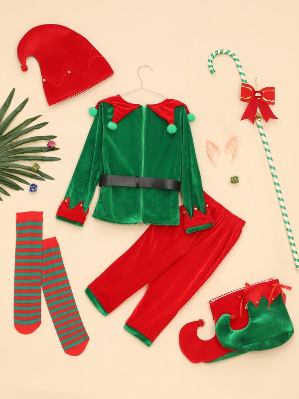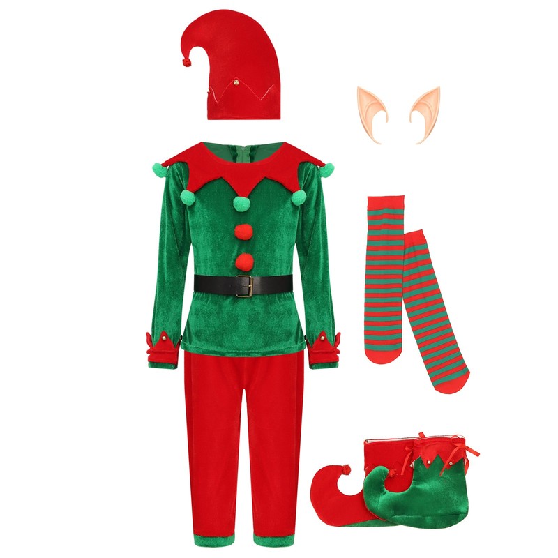 Set Include: 1Pc Boy Tops, 1Pc Pants, 1Pc Hat, 1Pair Stockings, 1Pc Belt, 1Pair Elf Ears, 1Pair Shoes