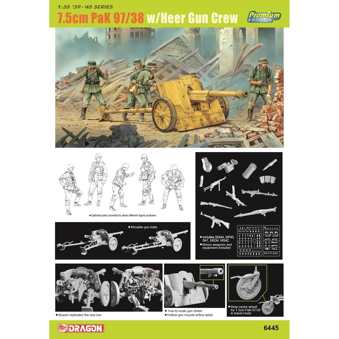 During World War II, Germany developed many anti tank guns, mainly used to destroy tanks and other armored targets, and was an important ground line of sight anti tank weapon on the battlefield. This time we will reprint two classic 1/35 scale German anti tank gun kits 6445 1/35 7.5cm PaK97/38 anti tank gun with artillery (hardcover version), and add some configurations on the basis of the original board, providing exquisite second-generation soldier weapon equipment.