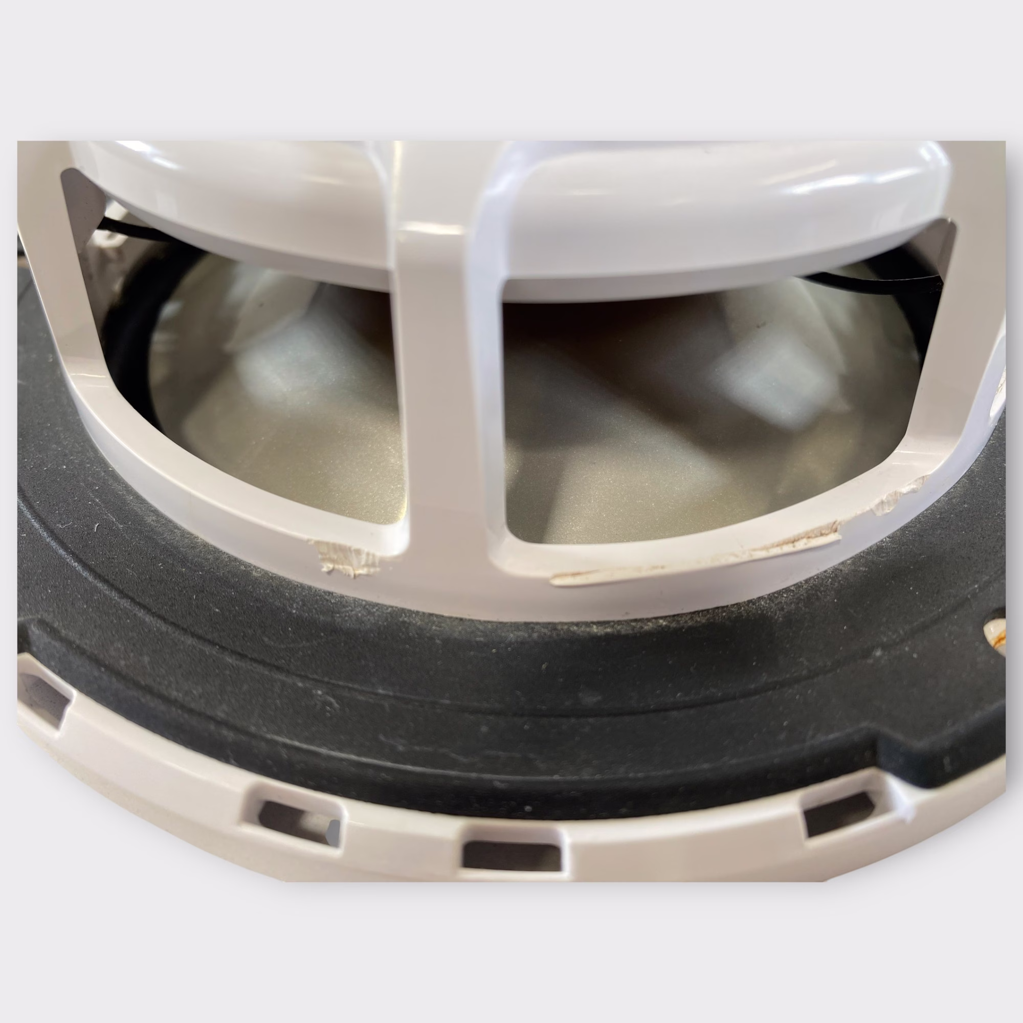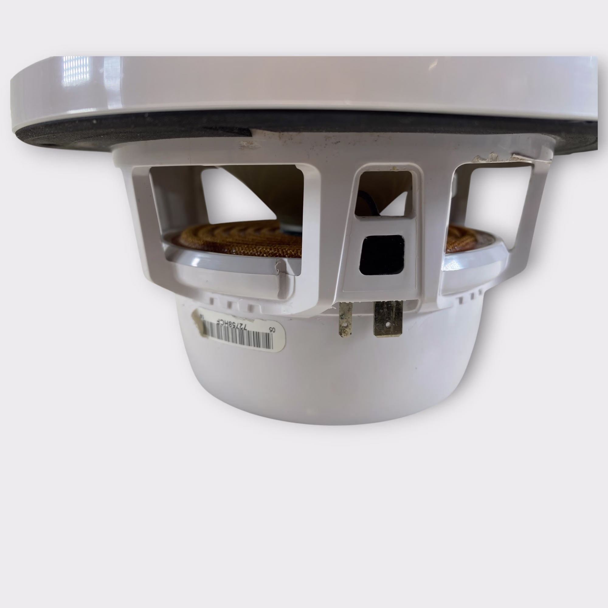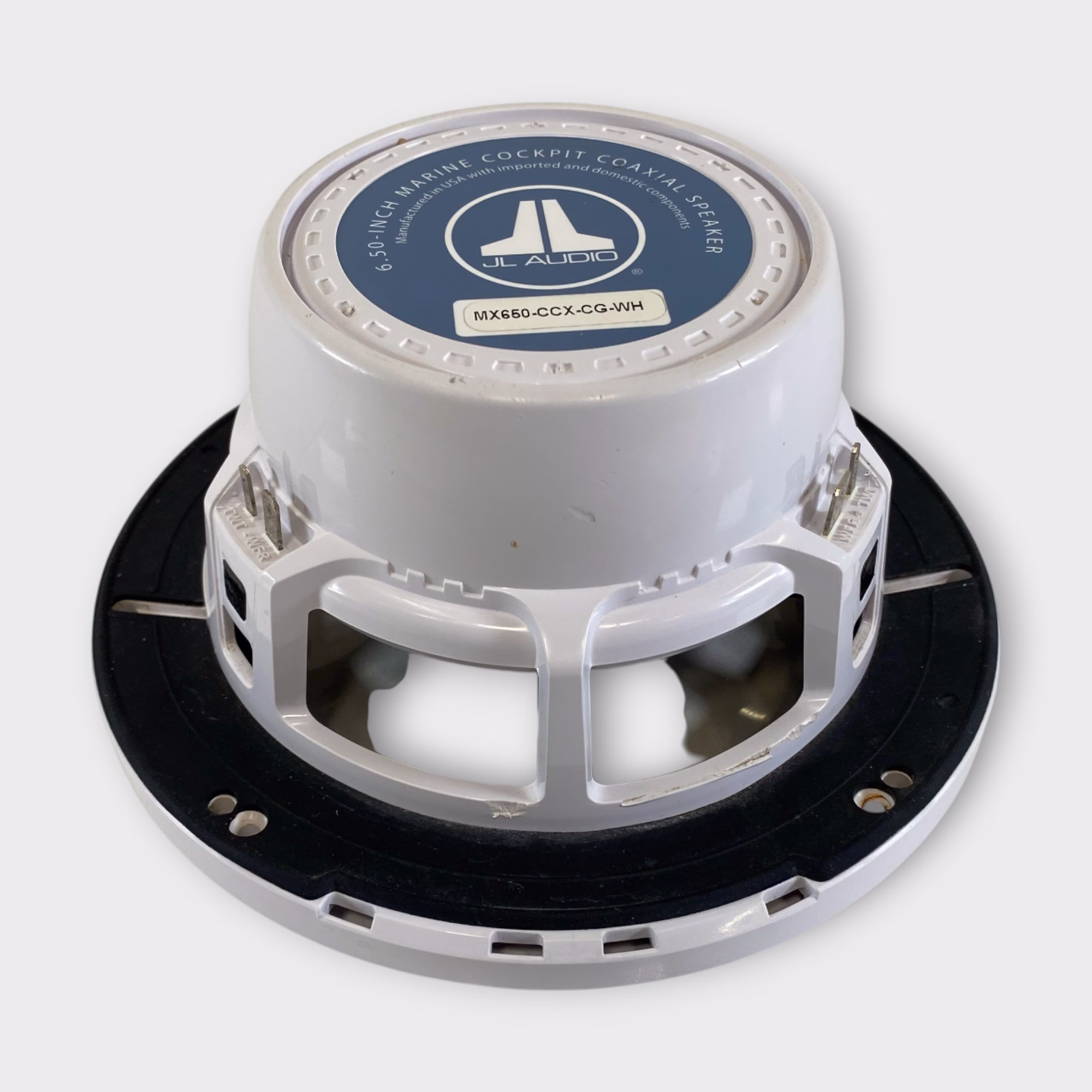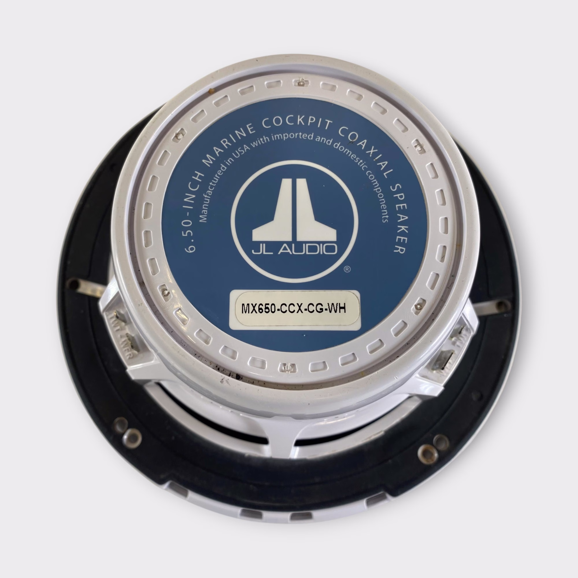 This listing is for a used single JL Audio MX650-CCX-CG-WH 6.5" marine speaker. This speaker is being sold without the grille and without the tweeter. It has been tested for basic woofer functionality and shows standard cosmetic wear from previous installation.