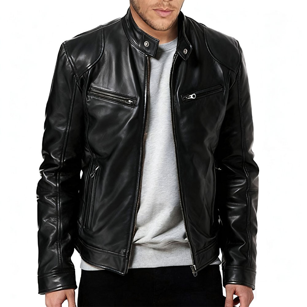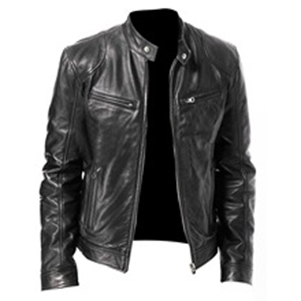 Men Casual PU Leather Jackets Punk Style with Zipper Stand Collar Coat