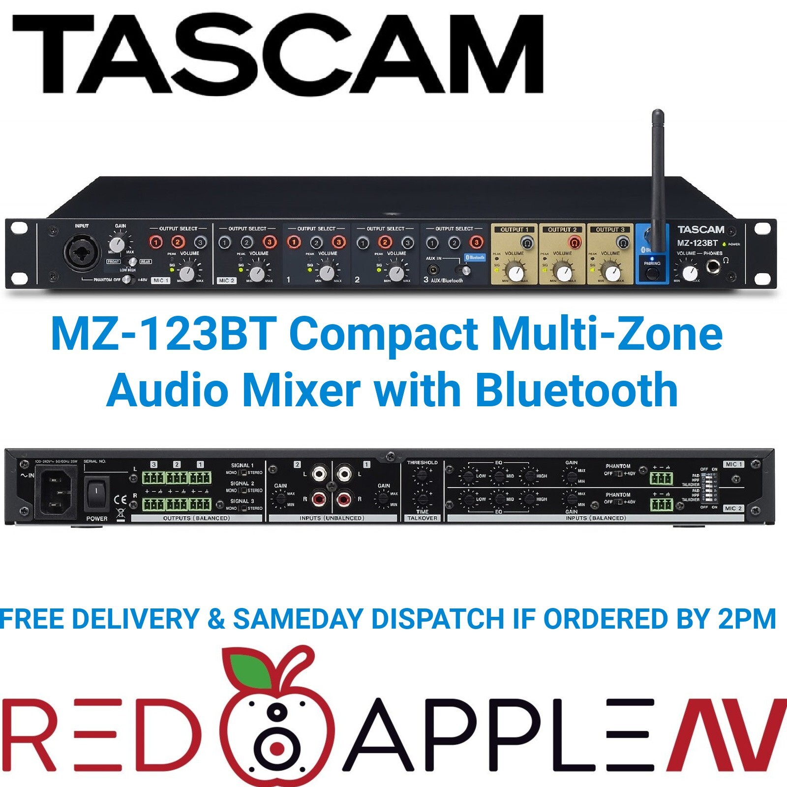 The Tascam MZ-123BT is a compact 1U multi-zone audio mixer designed for professional installations requiring flexible routing of background music and announcements across three independent output zones. Ideal for retail stores, restaurants, bars, cafés, hotels, gyms and any commercial environment, it delivers simple, reliable control with professional-grade audio performance.