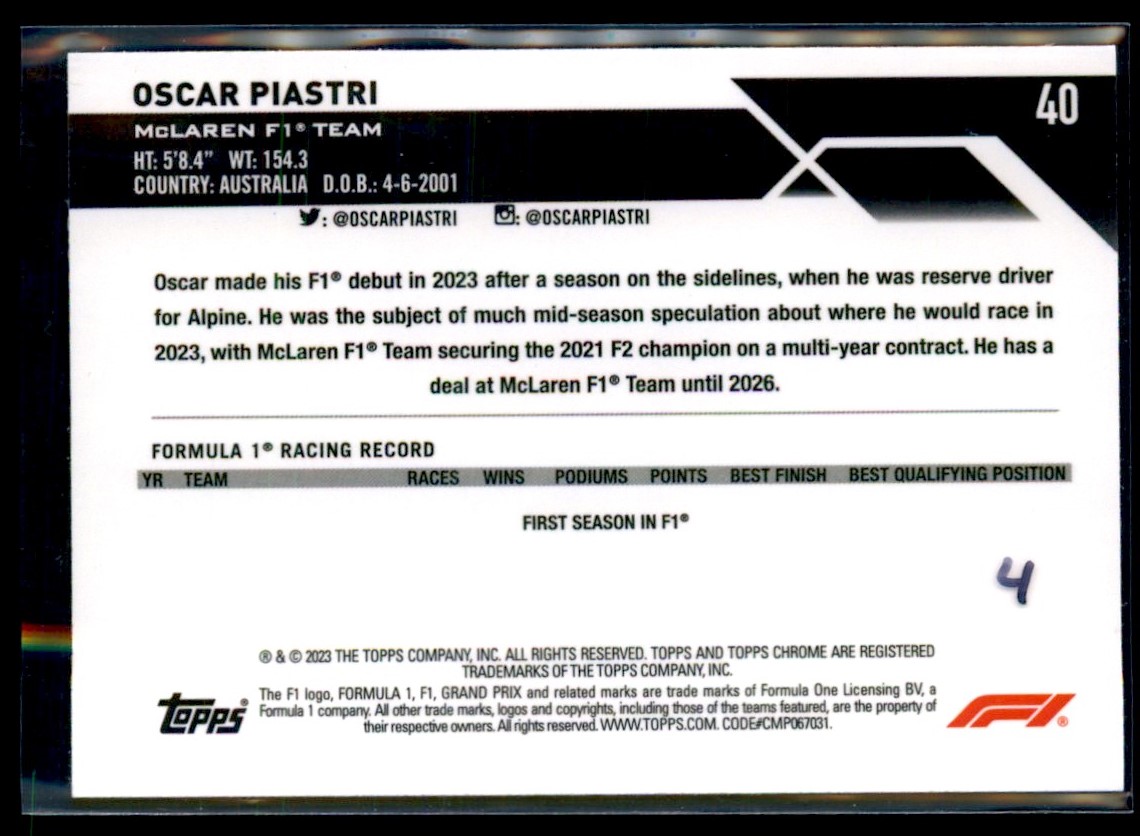 2023 Topps Chrome Formula 1 Oscar Piastri Rookie McLaren F1 Team #40