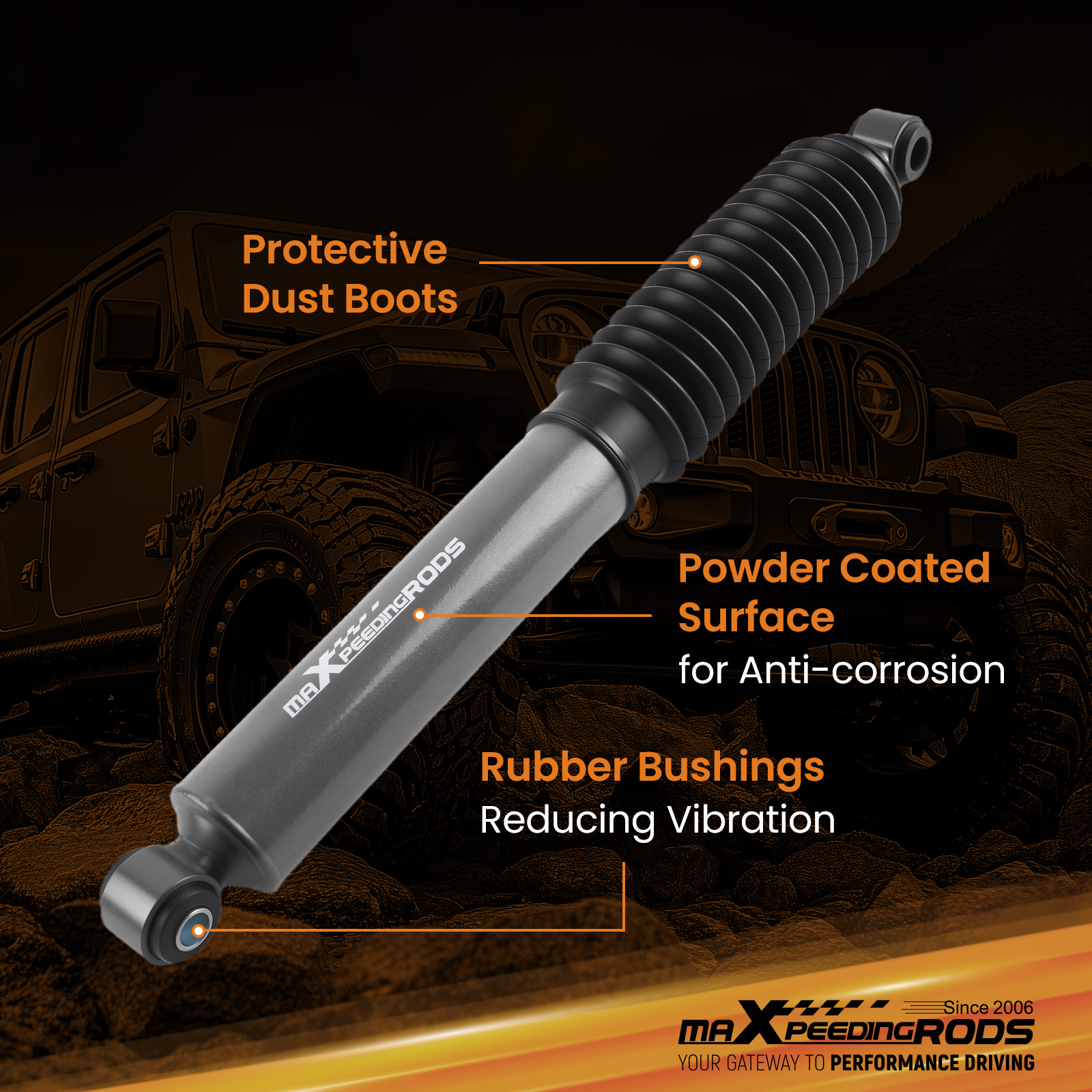 Features protective boot to safeguard shock rod and oil seal.