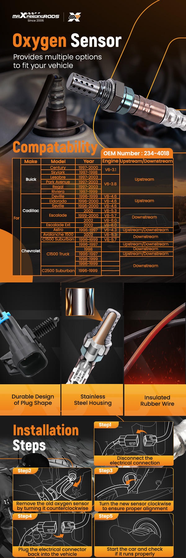The oxygen sensor is equipped with a stainless steel housing.