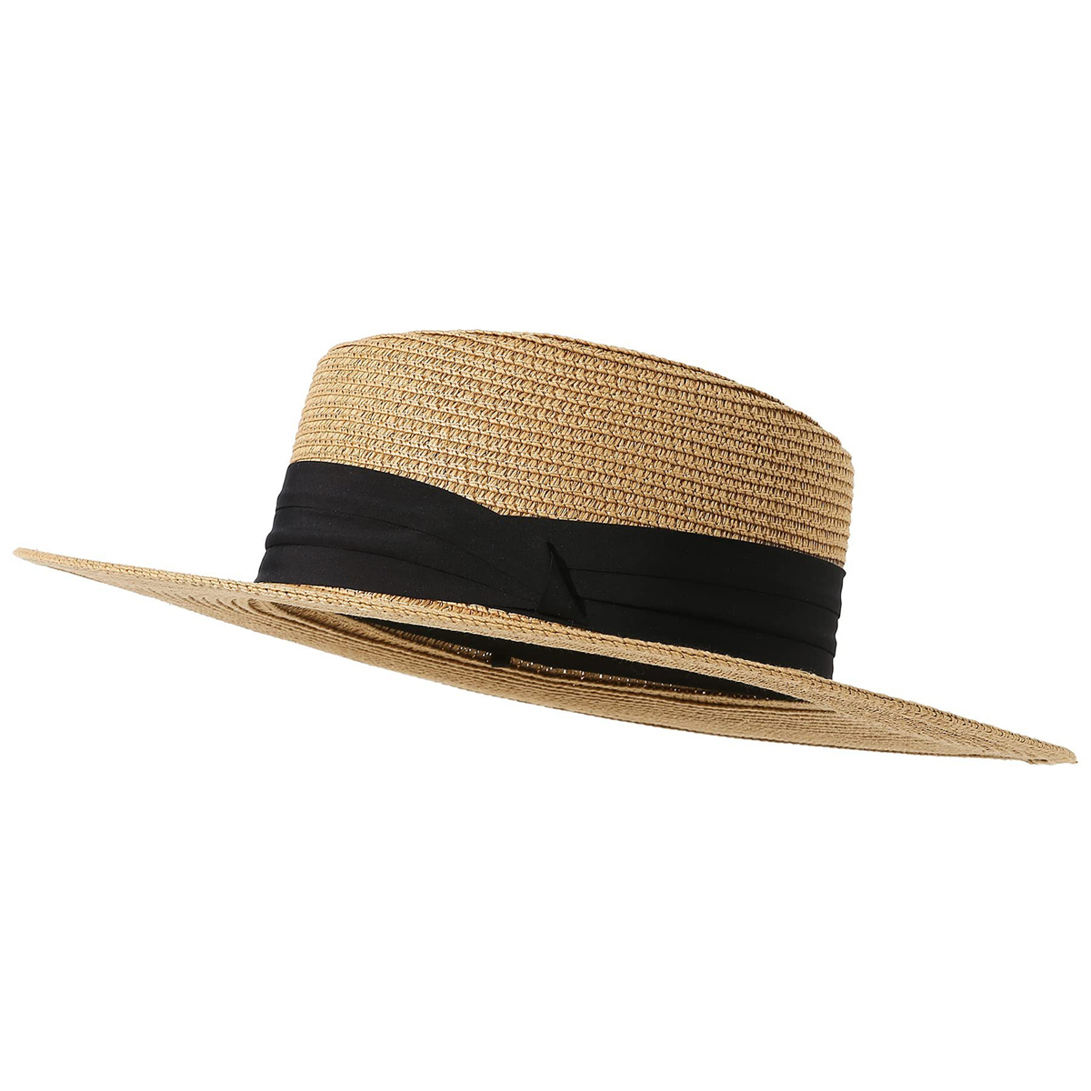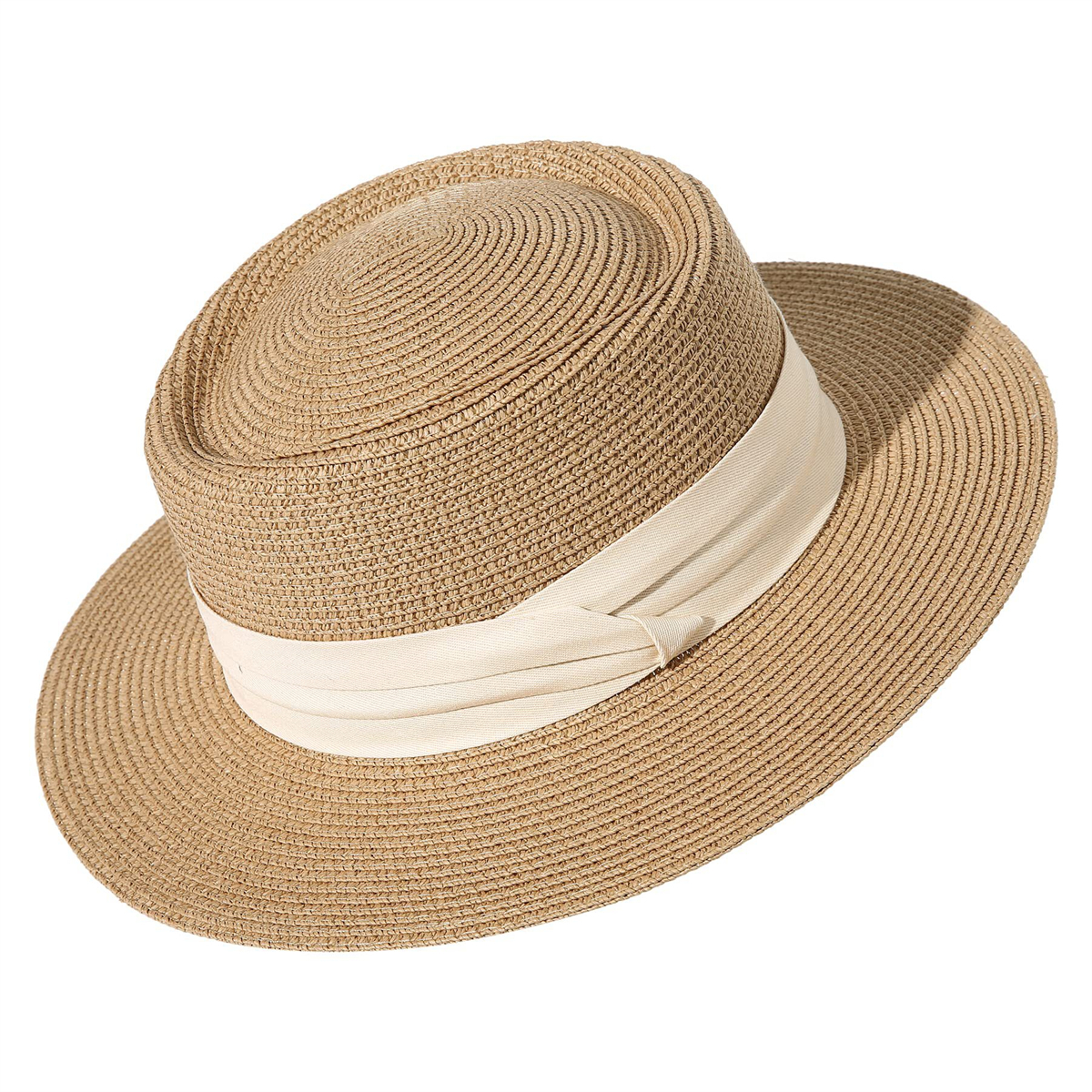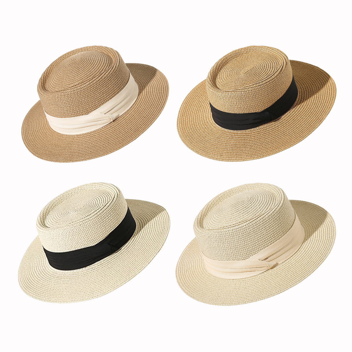 Summer Straw Boater Hat Wide Brim Summer Beach Sunhat Flat Top Caps Women Men