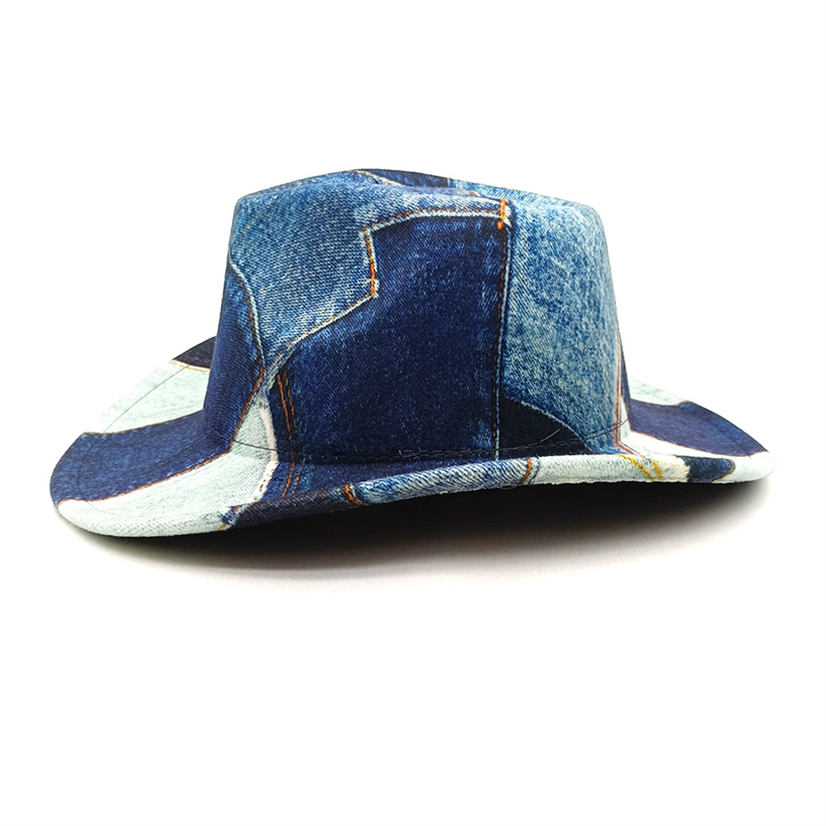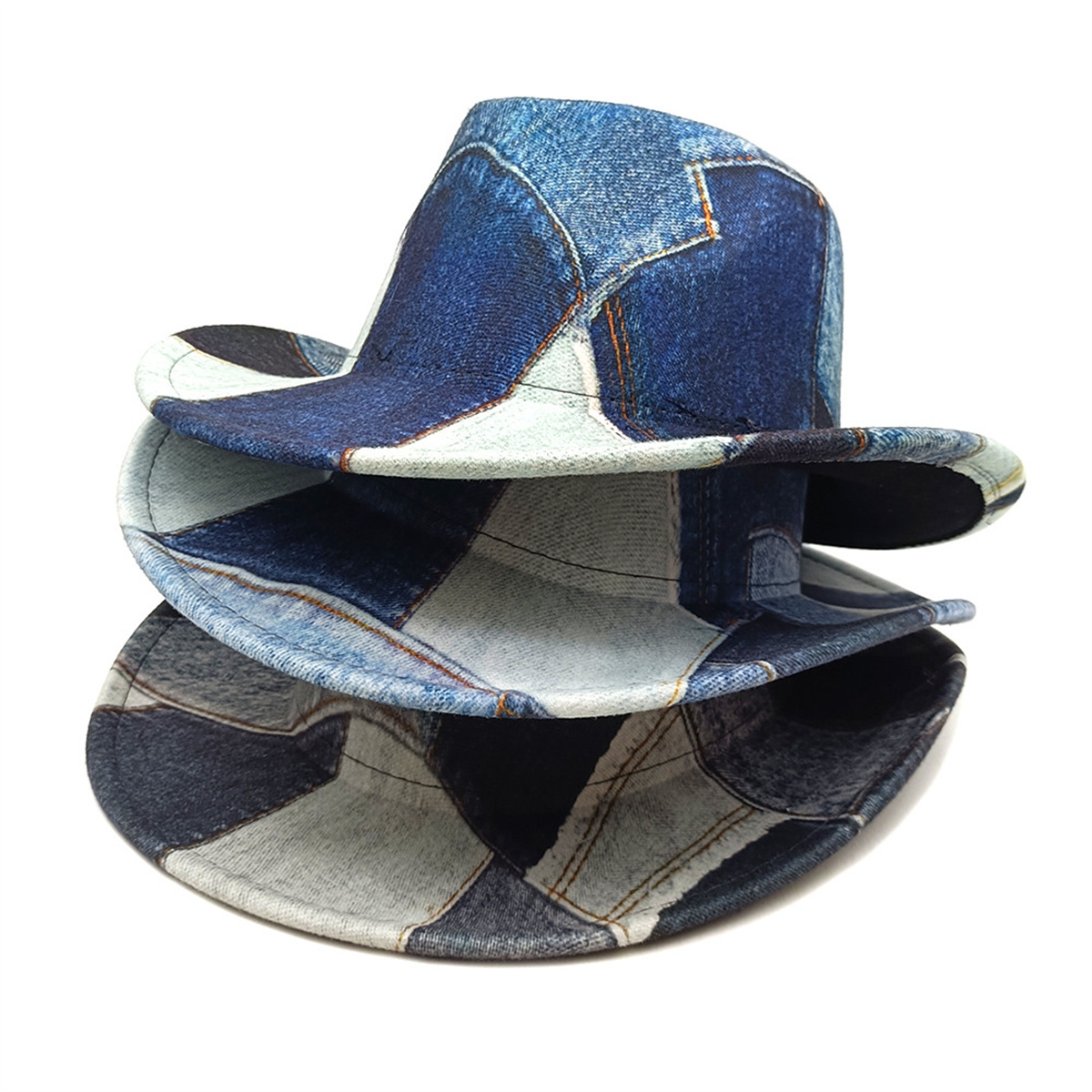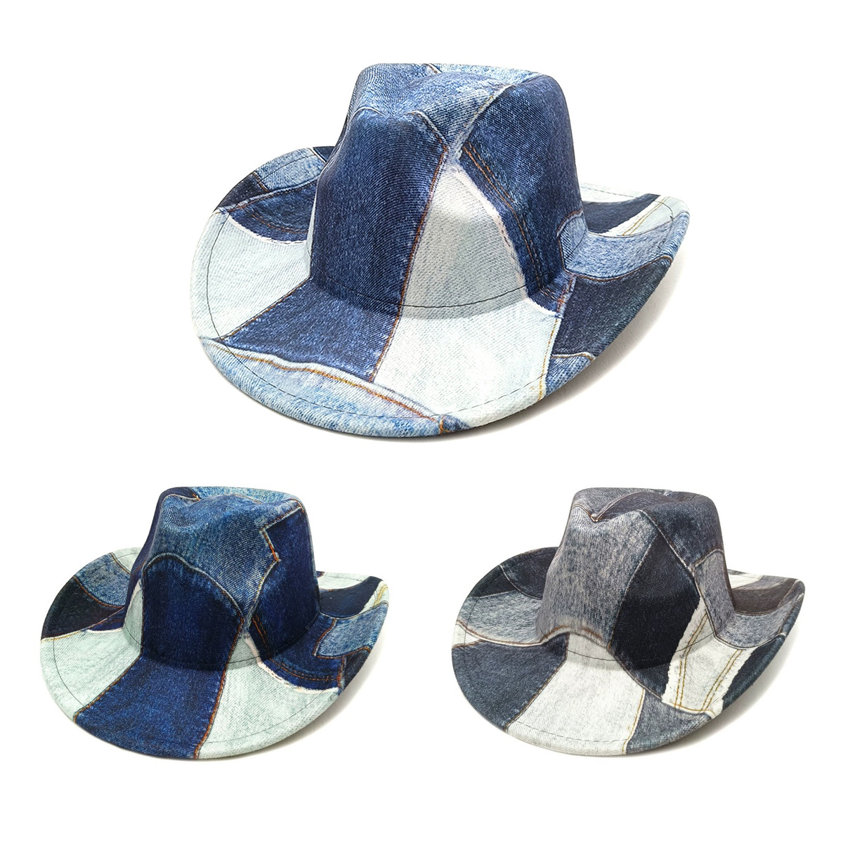 3.Fashion Design]: Wide brim cowboy hat with special splicing print design, the same color denim print fabric splicing, fashionable