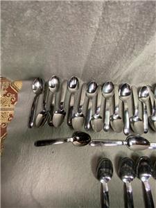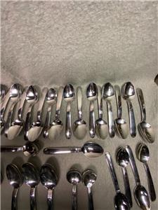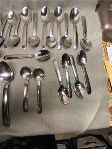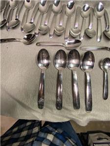 HERE, DIRECT FROM A LOCAL ESTATE, IS A MID CENTURY ONEIDA FLATWARE STAINLESS STEEL 35 SPOONS. THERE ARE 25 SOUP SPOONS, 4 TEA SPOONS, 4 SERVING SPOONS AND 2 SHERBET SPOONS. ALL ARE IN VERY GOOD CONDITION.