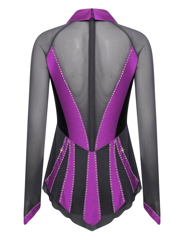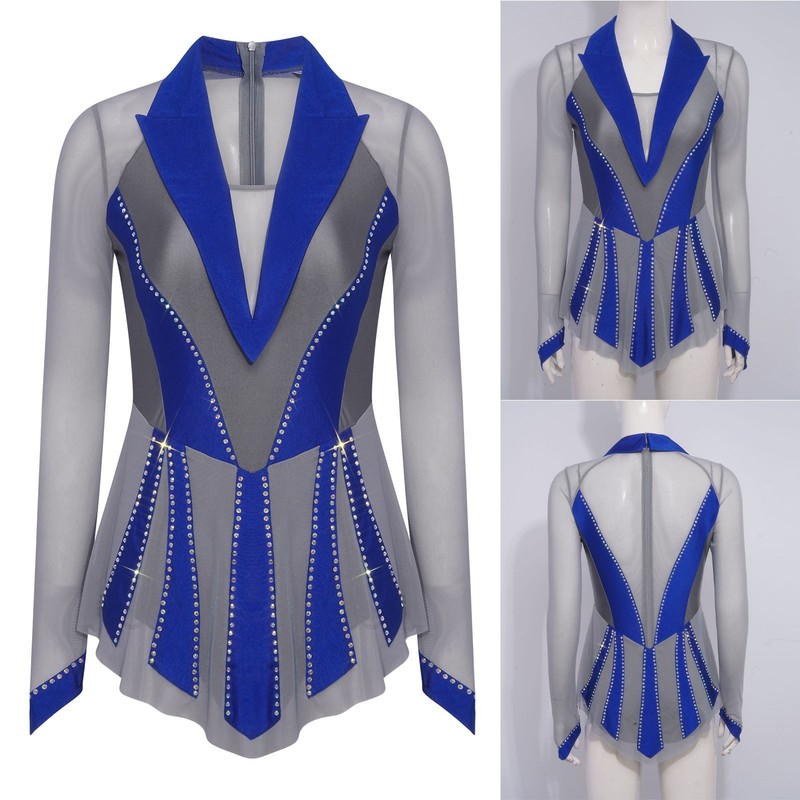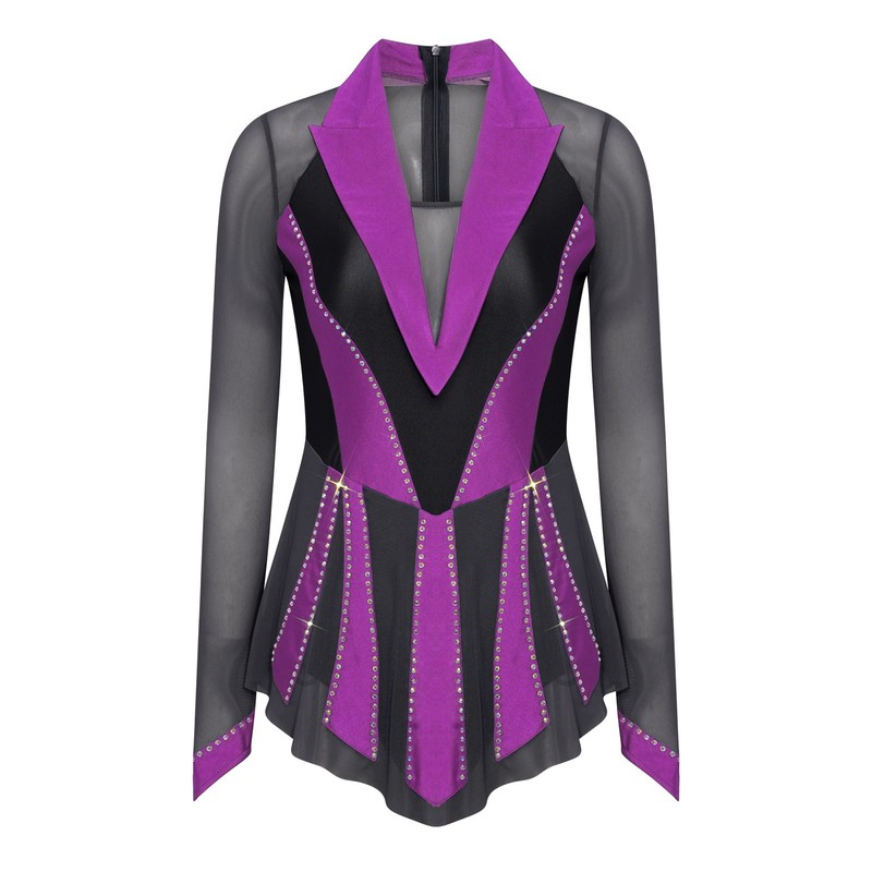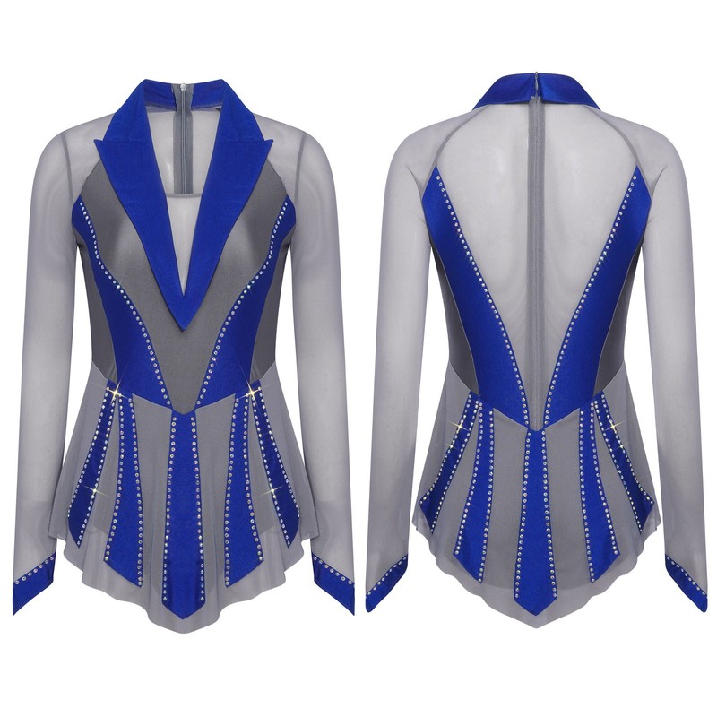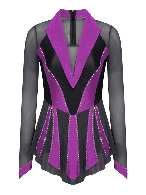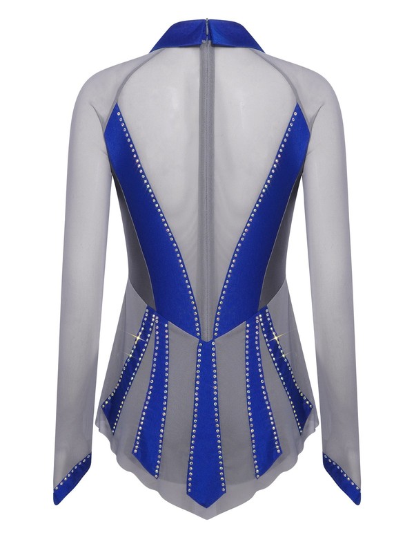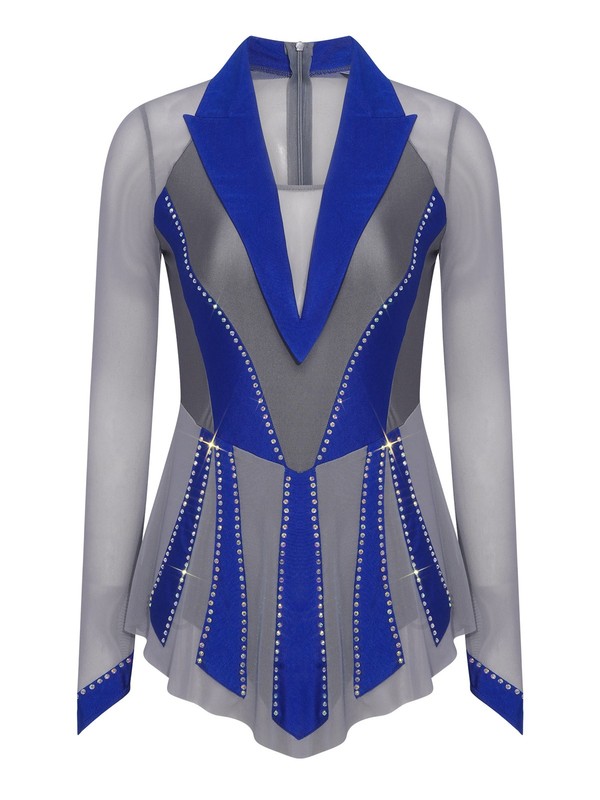 The sheer mesh patchwork and contrast color combination create a visually striking look, bringing a fashionable and modern element to the traditional figure-skating dress.