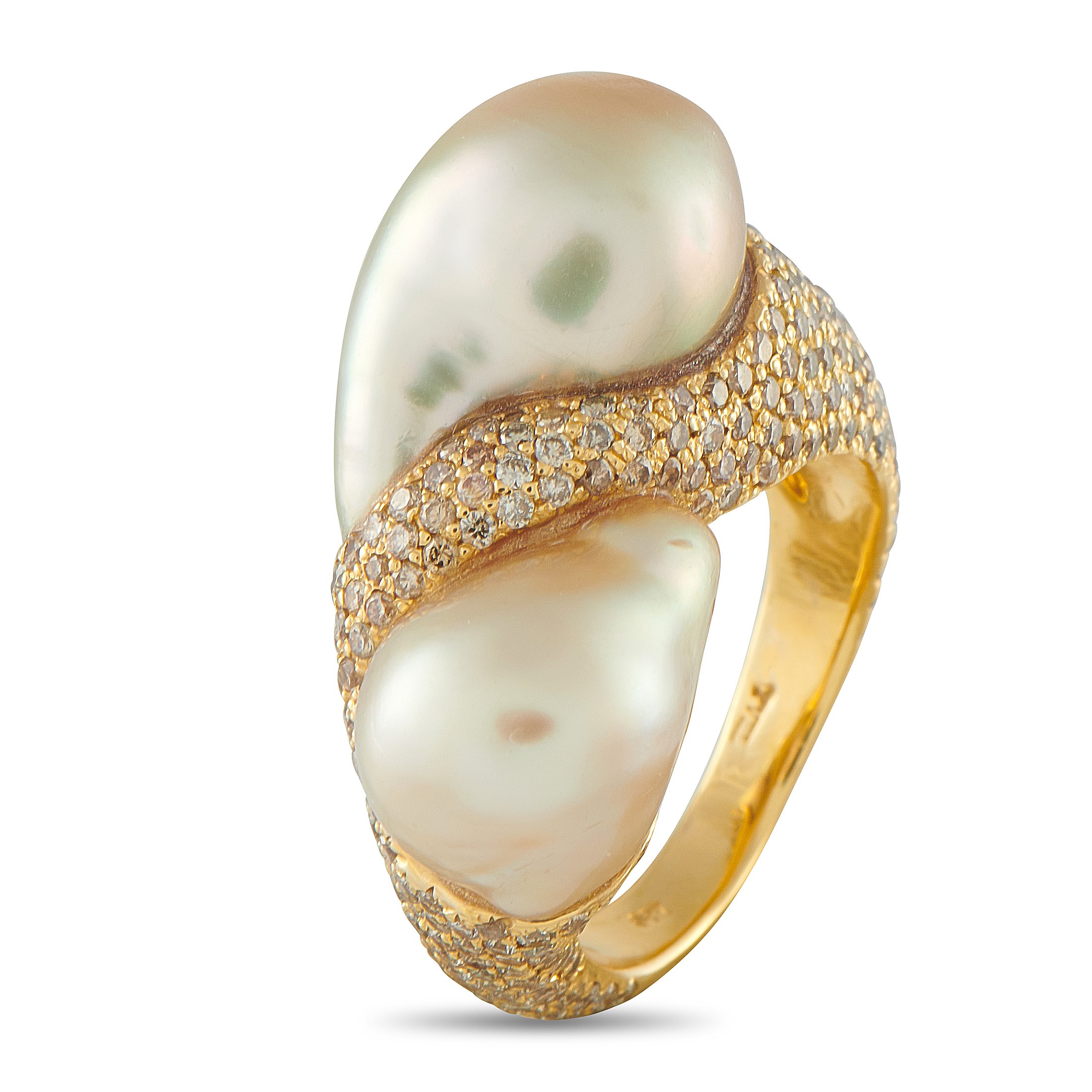 An artistic design makes this Yvel ring nothing short of breathtaking. The 18K Yellow Gold setting winds around the luminous Baroque Pearl, highlighting the dramatic shape of the captivating center stone. Inset Diamonds totaling 2.0 carats make it even more extraordinary. This impressive accessory features a 3mm wide band and a 17mm top height.This jewelry piece is offered in estate condition and includes a gift box.