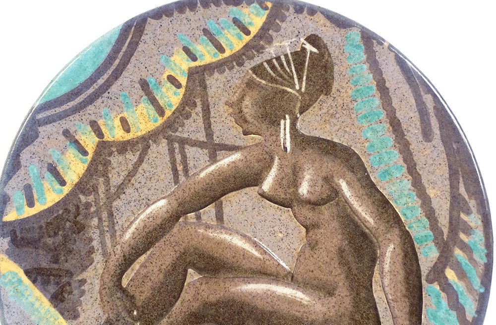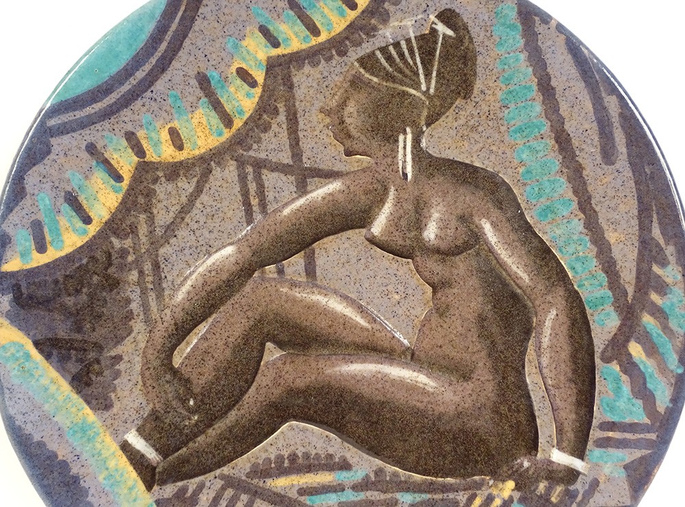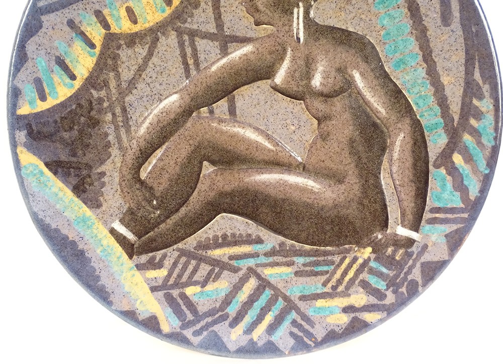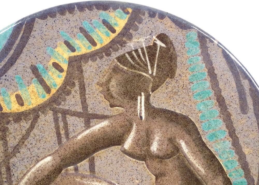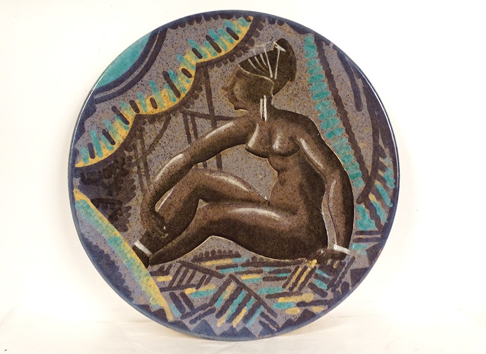 Rare grand plat décoratif en faïence de la Manufacture de Sèvres, signé A. Naudy pour le décorateur André Naudy*, à décor africaniste d'une belle femme nue assise dans un intérieur coloré, d'époque 1930 Art Déco XXème siècle.