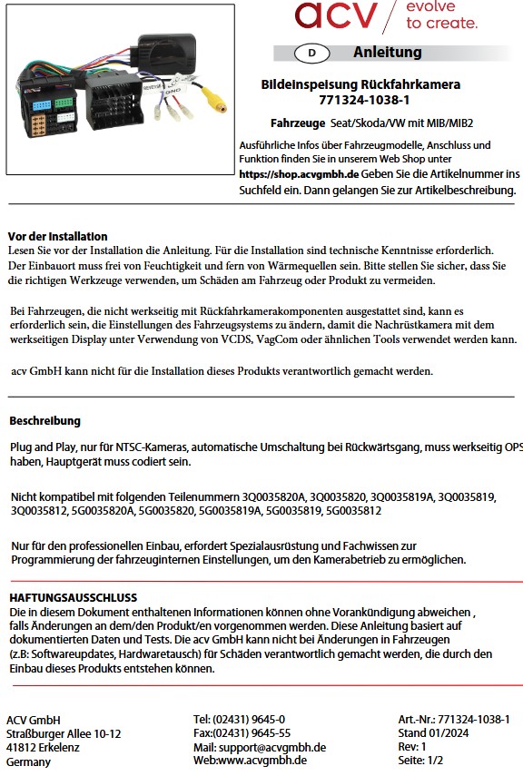 - Die Kamerafreischaltung muß vor der Installation im Fahrzeug codiert werden (z.B. mit VCDS-Software)!!!
