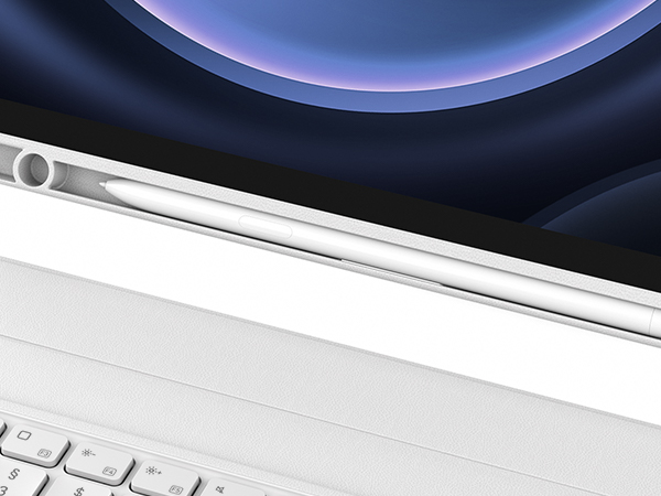 Zwei Halterungen an der Seite und der Rückseite sorgen für die sichere Aufbewahrung Ihres S Pens. Die Vorderseite der Tastatur verfügt über eine integrierte Halterung zur Aufbewahrung, die Rückseite über eine Aussparung zum Laden und Aufbewahren. Sie unterstützt das Platzieren und Laden des Samsung-Stifts, und die Stiftöffnung passt sich der Krümmung des S Pens an. Ideal für Reisen, Arbeit oder Schule