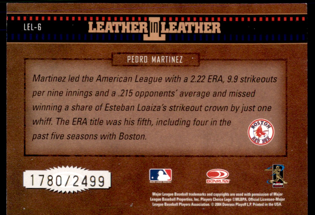 | 2004 Donruss Leather & Lumber in Pedro Martinez 1780/2499 Boston Red Sox #LEL-6 | ||||||||||||||||||