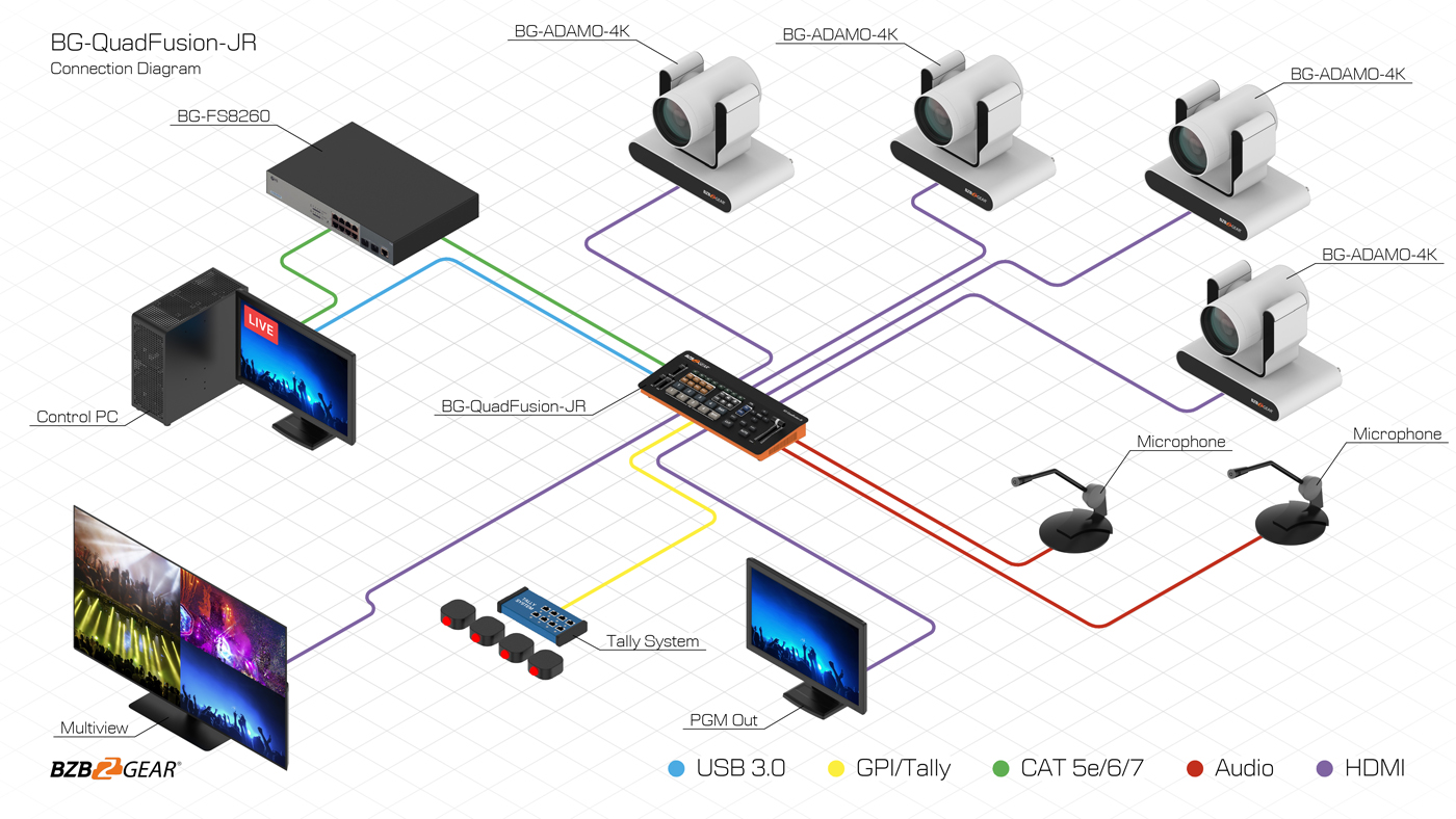 Débrochez le potentiel créatif: Équipé d'un convertisseur de format intégré, d'un générateur d'effets spéciaux et d'une entrée de signal vidéo frontal adaptatif, le BG-Quadfusion-Jr vous permet d'explorer des avenues créatives sans fin. Artisanat des expériences visuelles captivantes qui élèvent votre contenu à des hauteurs sans précédent.
