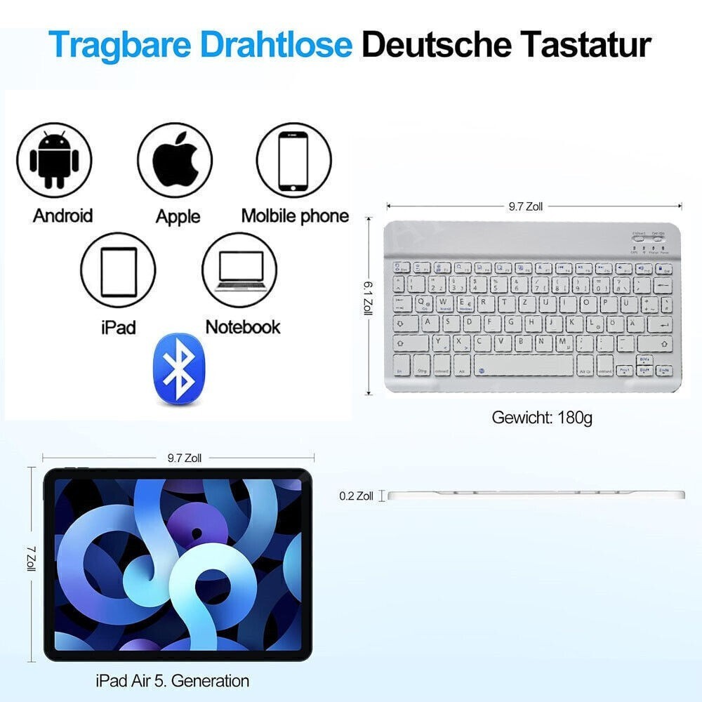 【Kompatibilität】 Diese kabellose Tastatur ist kompatibel mit iPad, PC, Smartphone, Windows, Android, MacOS, Tablets, geeignet für iPad Pro 11 Zoll, iPad Pro 12,9 Zoll, iPad Air 5. Generation/iPad Air 4. Generation 10,9 Zoll, iPad 9. / 8./ 7. Generation 10,2 Zoll, iPad 5./ 6. Generation 9,7 Zoll, iPad Mini und andere intelligente elektronische Geräte.