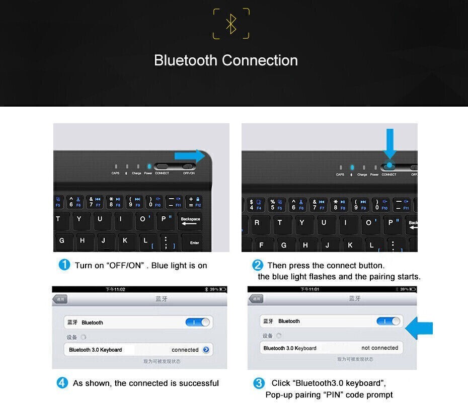 【Tragbare kabellose Tastatur】 ABS-Material, fingerabdruckfrei und kratzfest; leichtes und dünnes, kabelloses Bluetooth-Design, sodass Sie es problemlos in Ihren Rucksack oder Ihr Gepäck stecken können. Die Tastatur ist mit dem iPad kompatibel, sodass Sie jederzeit wie mit einem Laptop arbeiten können.