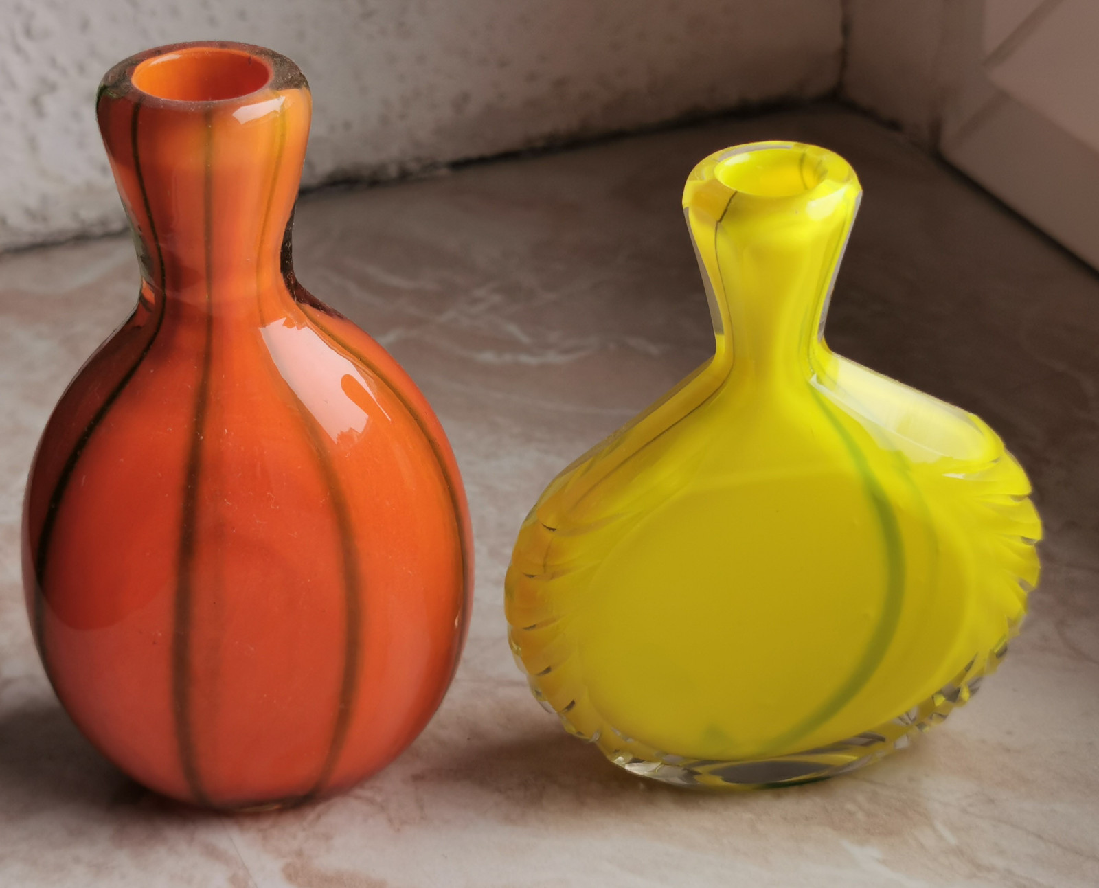 2 Schnupftabak Flasche aus Glas, Flakon gelb, orange Überfangglas Handarbeit.
