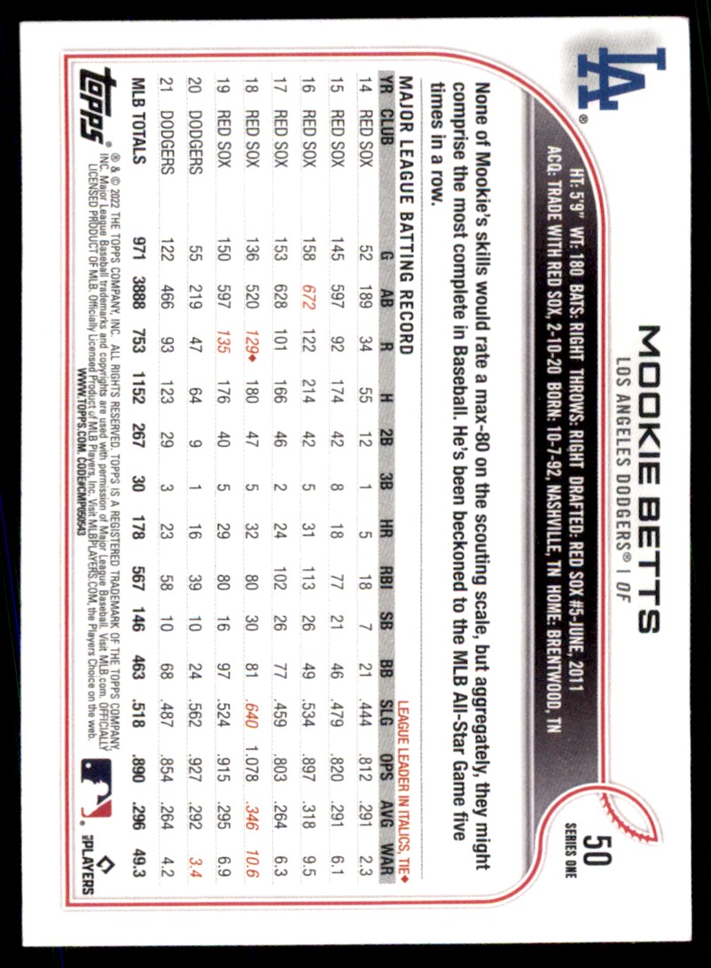| 2022 Topps Mookie Betts Los Angeles Dodgers #50 | ||||||||||||||||