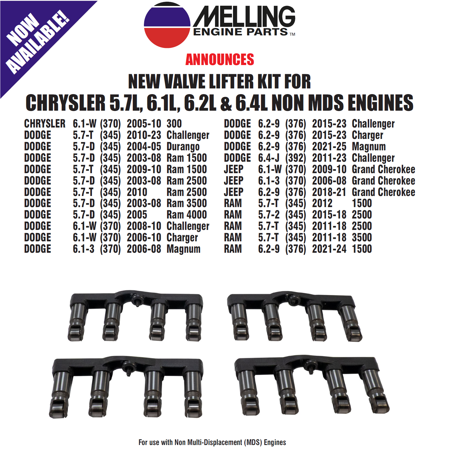 Valve Lifter Kit for Chrysler 5.7L, 6.1L, 6.2L & 6.4L Non MDS