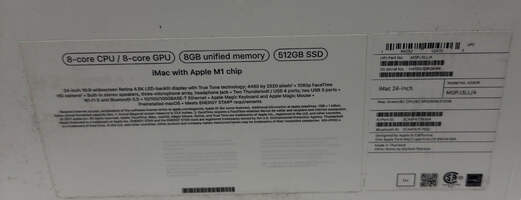 2021 Apple iMac 24" M1 3.2GHz 8GB RAM 512GB SSD Silver- Parts Only Items included in this sale: 2021 Apple iMac 24" M1 3.2GHz 8GB RAM 512GB SSD Silver Apple Magic Mouse Apple Magic Keyboard Power Cord (2m) Power Adapter Original Box *Please note, if it is not listed it is not included - such as power cables or other accessories. Specifications: Collection Apple Computers Sub-Collection Apple iMac Brand Apple Model iMac MPN MGPD3LL/A Release Year 2021 Processor Brand Apple Processor M1 Processor Generation N/A Processor Cores 8 Core Processor Speed 3.2GHz GPU (Cores) or Graphics Card 8 Core Memory (RAM) 8GB RAM Storage 512GB Storage Type SSD Integrated Graphics M1 Screen Size 24" Display Retina 4.5K Display Resolution 4480 x 2520 Retina Yes Bluetooth Yes Webcam Yes Microphone Yes WiFi Yes Color Blue Has Limited Warranty? No Apple Limited Warranty Has AppleCare+? No AppleCare+ Operating System N/A Condition Good Connections Thunderbolt 4 / USB-C 4.0 USB-C 4.0 Power Port 3.5mm Audio Jack Ethernet Port UPC 194252124703 Serial# H4TGQ1D8Q6W6 Password password Cosmetic condition: The screen is in good condition with some minor wear and scuffs. The back panel is in good cosmetic condition with minimal wear. All four sides are in good cosmetic condition with minimal wear. All of the ports are in good condition and clean. The hinge is in good condition, sturdy and functioning properly. Please view our close up photos, as these are taken of the actual item being offered for sale. Functionality condition: The display is fully functional with no damage or issues. I was able to connect to a WiFi network and test the audio by playing a video. The WiFi and audio are both fully functional.
