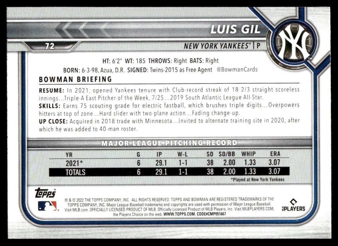 2022 Bowman Luis Gil Rookie New York Yankees #72