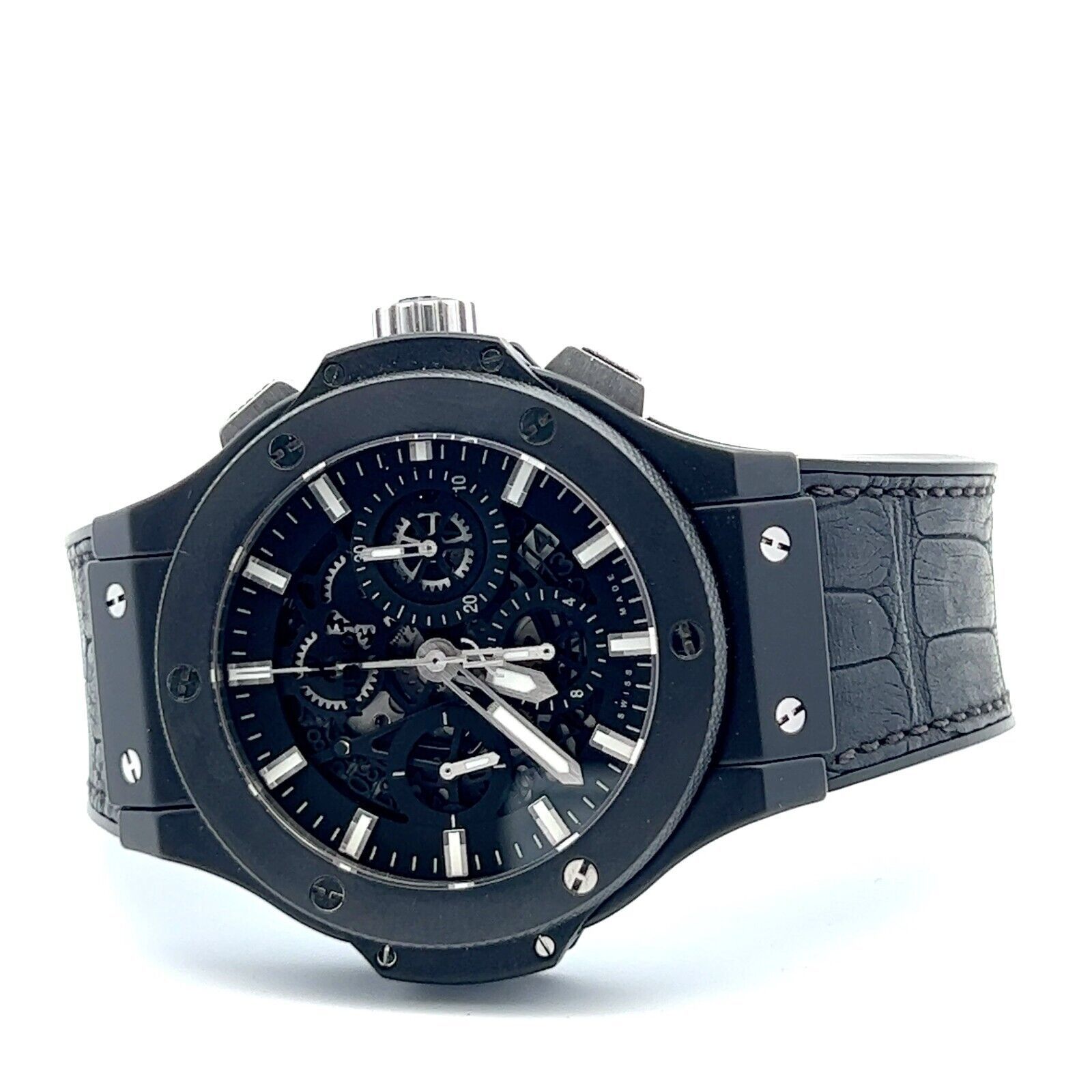 This Big Bang Aero Bang “Black Magic” features a striking skeleton dial housed in a sleek black ceramic case, showcasing the brand’s signature fusion of high‑tech materials and luxury watchmaking. The automatic movement is fully visible through the openworked dial, delivering a powerful, contemporary aesthetic. The watch is pre‑owned and has been carefully maintained.