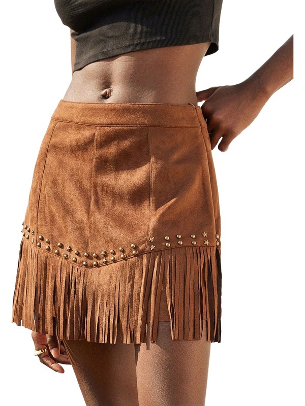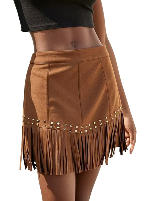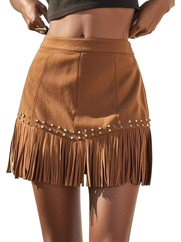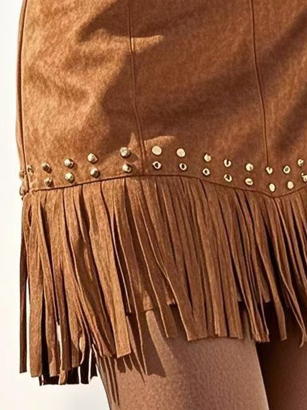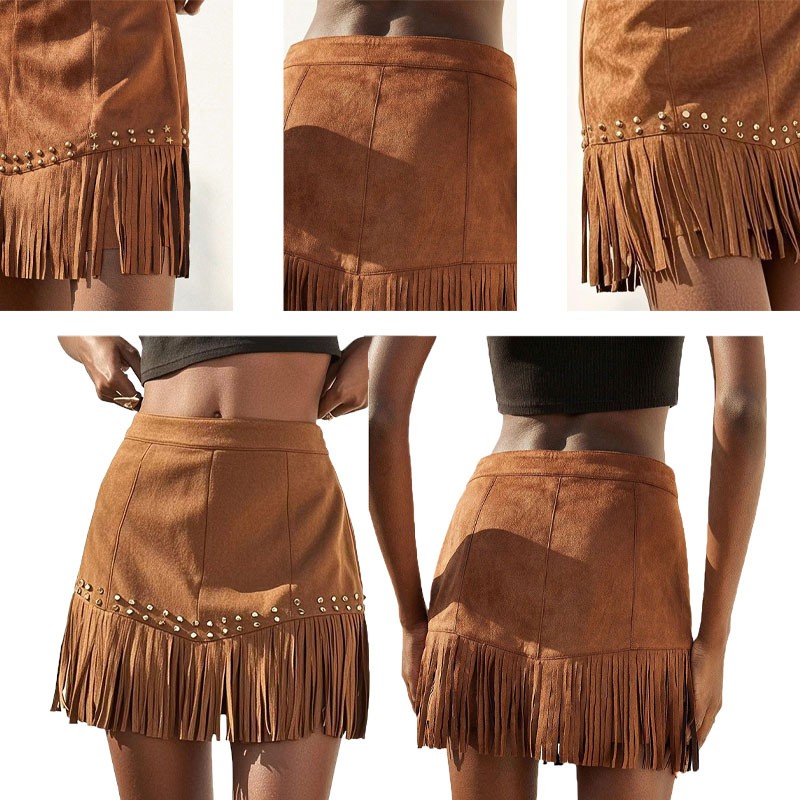 The cowgirl-inspired design with fringe, gold stud embellishments, and a tassel hem is a trendy and eye-catching look, perfectly in line with the current fashion trends.