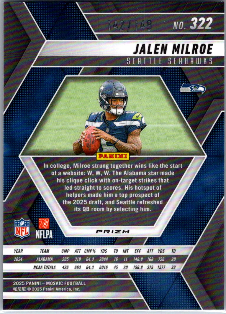 2025 Panini Mosaic Silver Knight Jalen Milroe Rookie 142/149 Seattle Seahawks