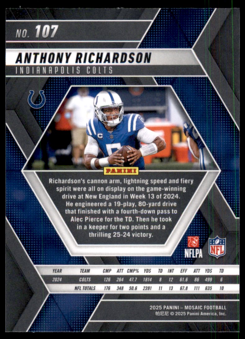 | 2025 Panini Mosaic Anthony Richardson Indianapolis Colts #107 | ||||||||||||||||