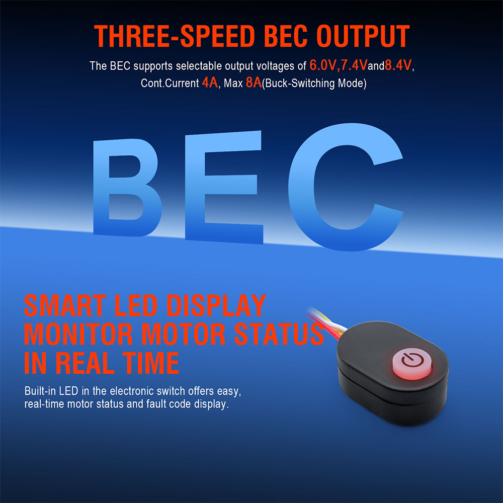 BEC Output: 6.0V/7.4V/8.4V Cont.Current 4AMax 8A(Buck-Switching Mode)