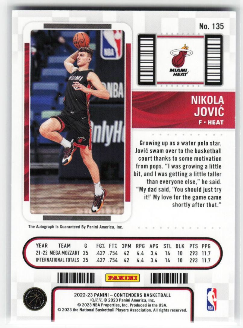 2022-23 Panini Contenders Rookie Ticket Auto Nikola Jovic RC Auto #135 Miami