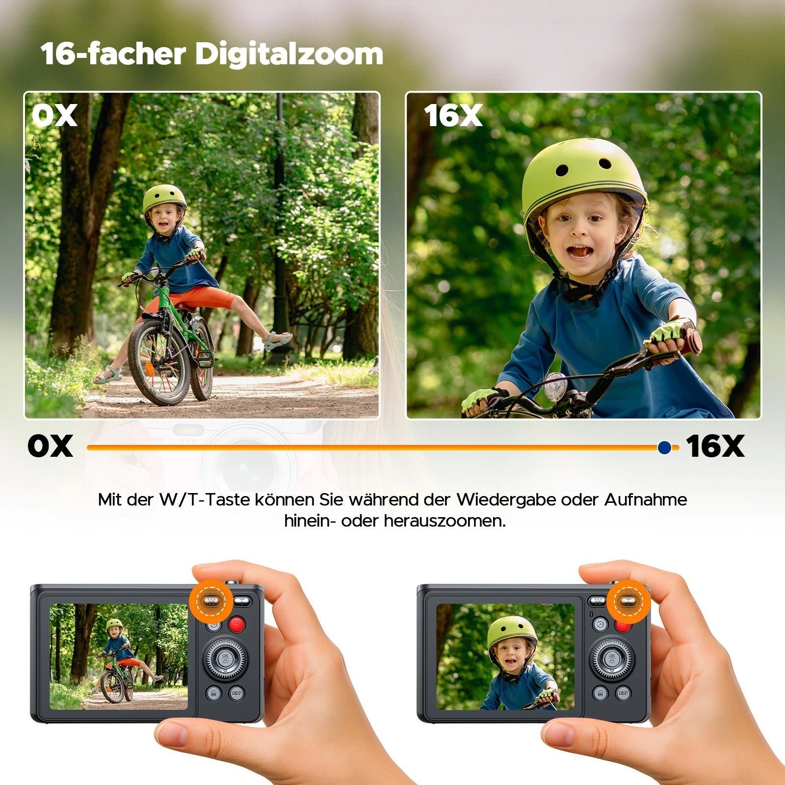 📸【16-facher Digitalzoom und Blitzlicht】 – Die Reisekamera verfügt über einen 2,8-Zoll-Bildschirm und einen 16-fachen Digitalzoom. Während Sie Fotos oder Videos aufnehmen, können Sie mit der W/T-Taste hinein- oder herauszoomen, sodass Sie detaillierte Nahaufnahmen oder weit entfernte Objekte aufnehmen können. Die Vintage-Digitalkamera verfügt über einen eingebauten Blitz, der mit der Blitztaste eingestellt werden kann, sodass Sie auch in dunklen Umgebungen klare Fotos aufnehmen können