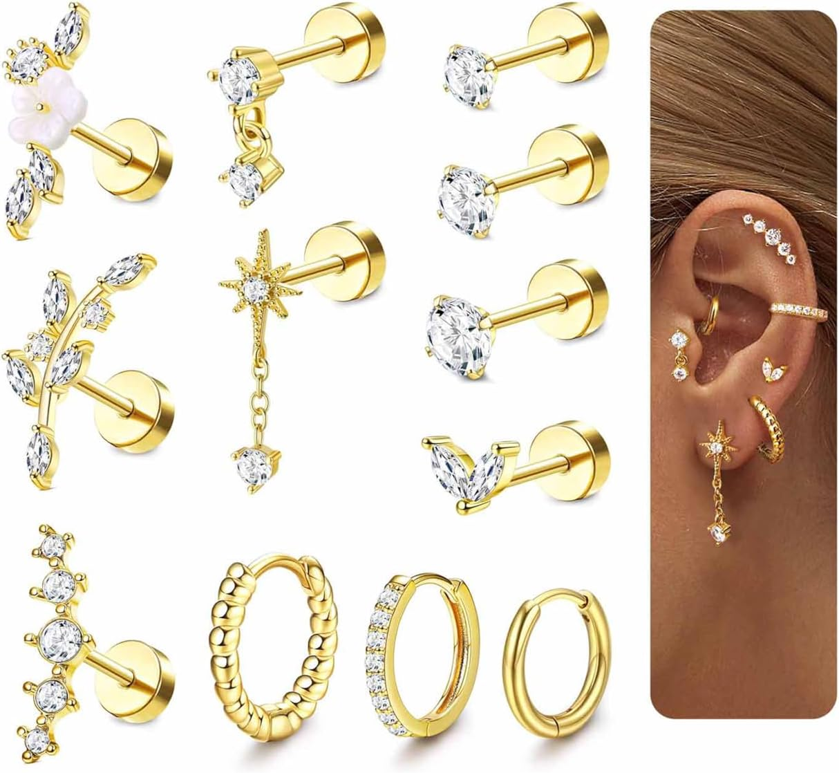 - Cartilage Earring Sets for Multiple Piercing---12PCS Single 16G cartilage earrings for women,including 3PCS ear climber earrings,3PCS CZ flat back stud earrings tragus,2PCS dangle helix earrings,3PCS conch hoop piercing jewelry.The piercing earrings set look great worn alone or mixed or matched with other earrings,just enjoy DIY fun with your piercing jewelry
