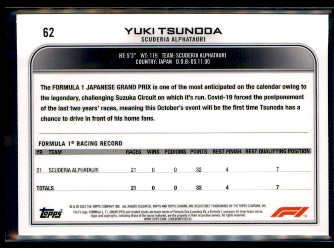 YUKI TSUNODA 2022 TOPPS CHROME F1 SAPPHIRE #62