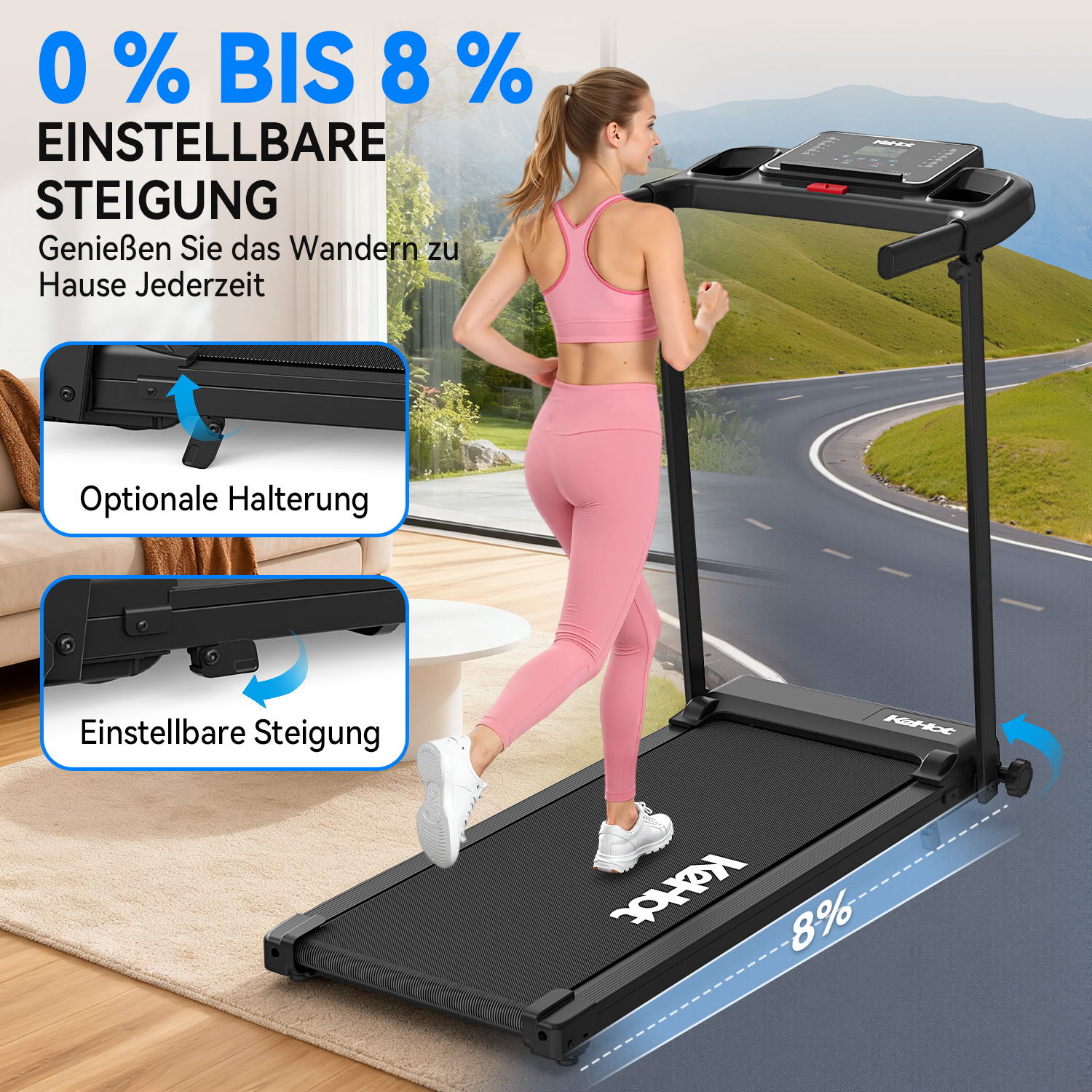 Die manuell einstellbare Steigung ermöglicht intensivere Workouts, simuliert leichte Bergwege und erhöht den Kalorienverbrauch ohne zusätzliche Geräte.