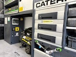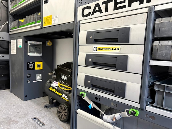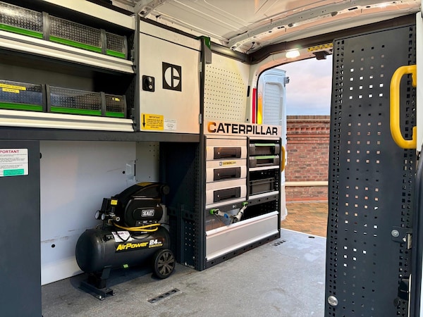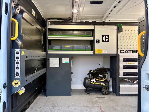 Then in the rear of this van it has had a small fortune spent on it converting it to a mobile fitters van with Bott racking and draw units down both sides, storage boxes, heavy duty fold out vice, heavy duty 110v & 240v power, air compressor, extra LED internal lights, hot water hand wash, roof mounted fresh air roof vent, LED amber flashing lights, LED roof mounted work lights, you name it this van has it!!!