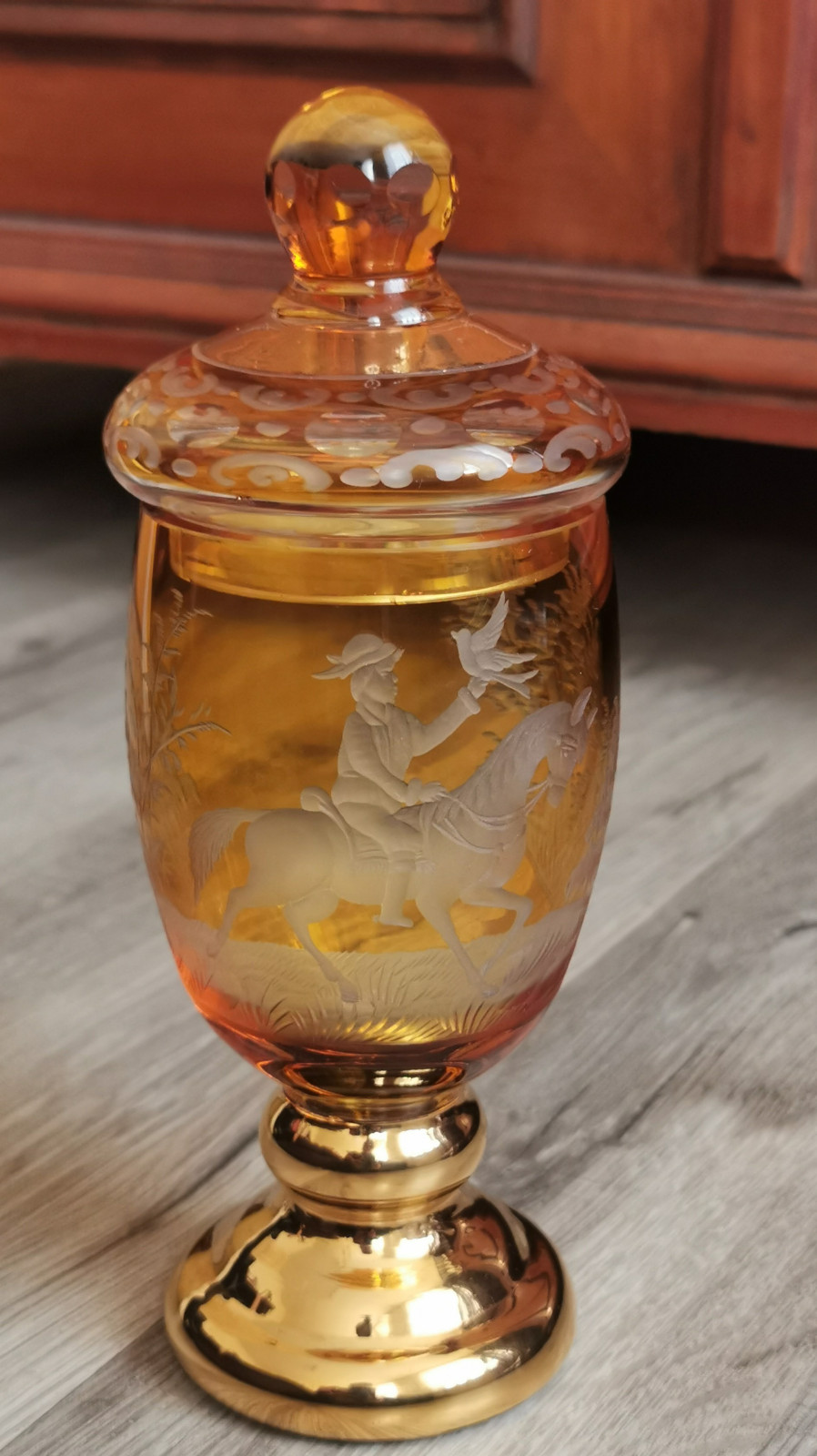 Jagdpokal, Deckelpokal, geschliffene Motive Jäger auf Pferd, Bäume, Bernsteinfarben, Gold.